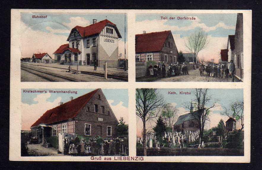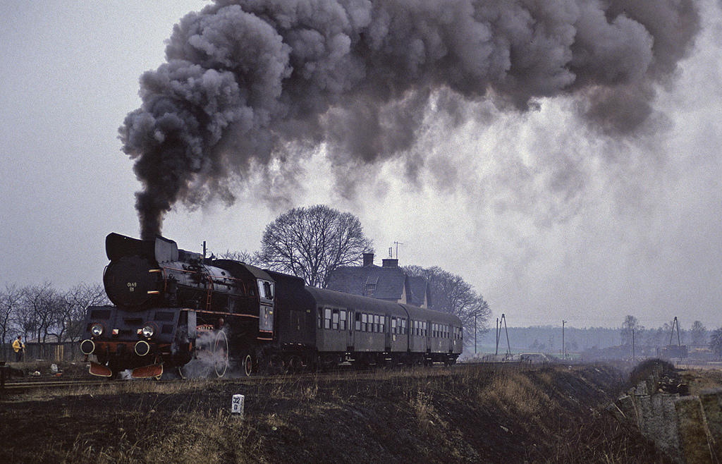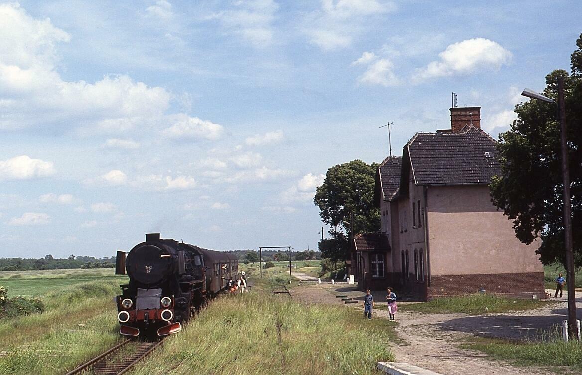 Popołudniowy pociąg z Nowej Soli do Wolsztyna, zaprzężony do Oelki opuszcza stację Lubięcin. Widok w kierunku południowo-zachodnim (Nowa Sól).