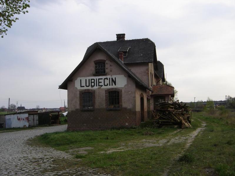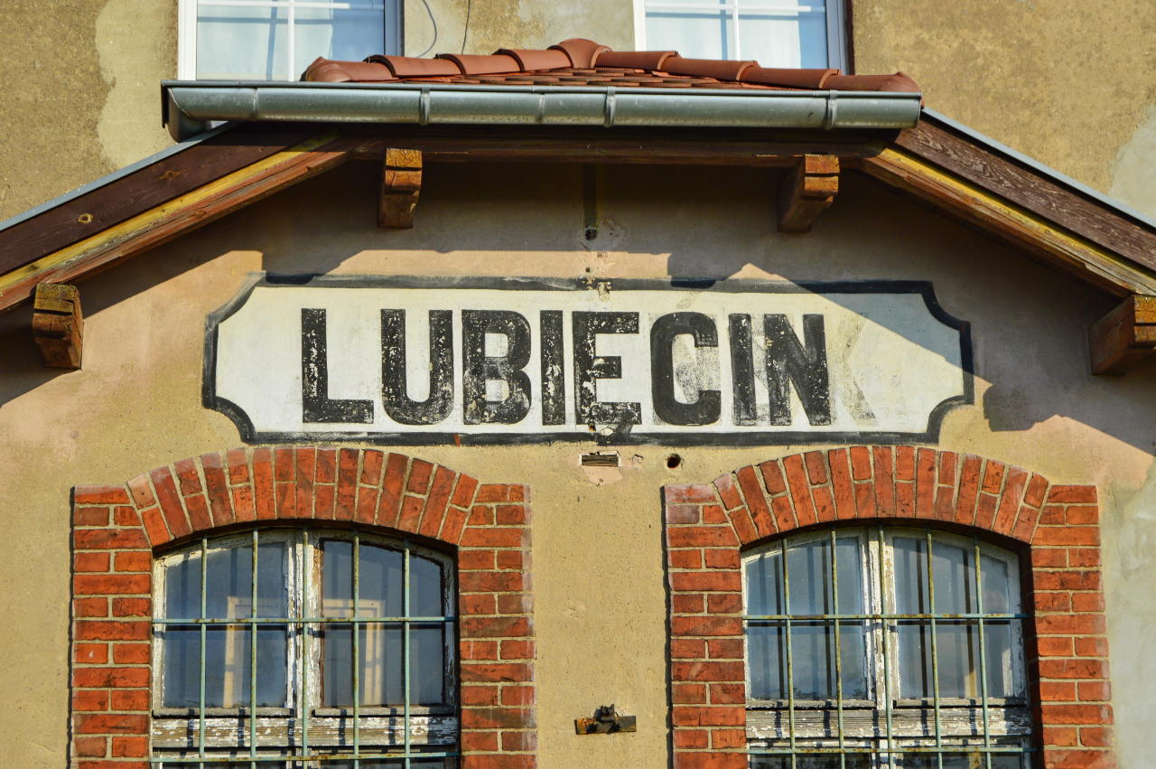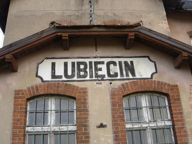 Lubięcin napis na budynku dworca.