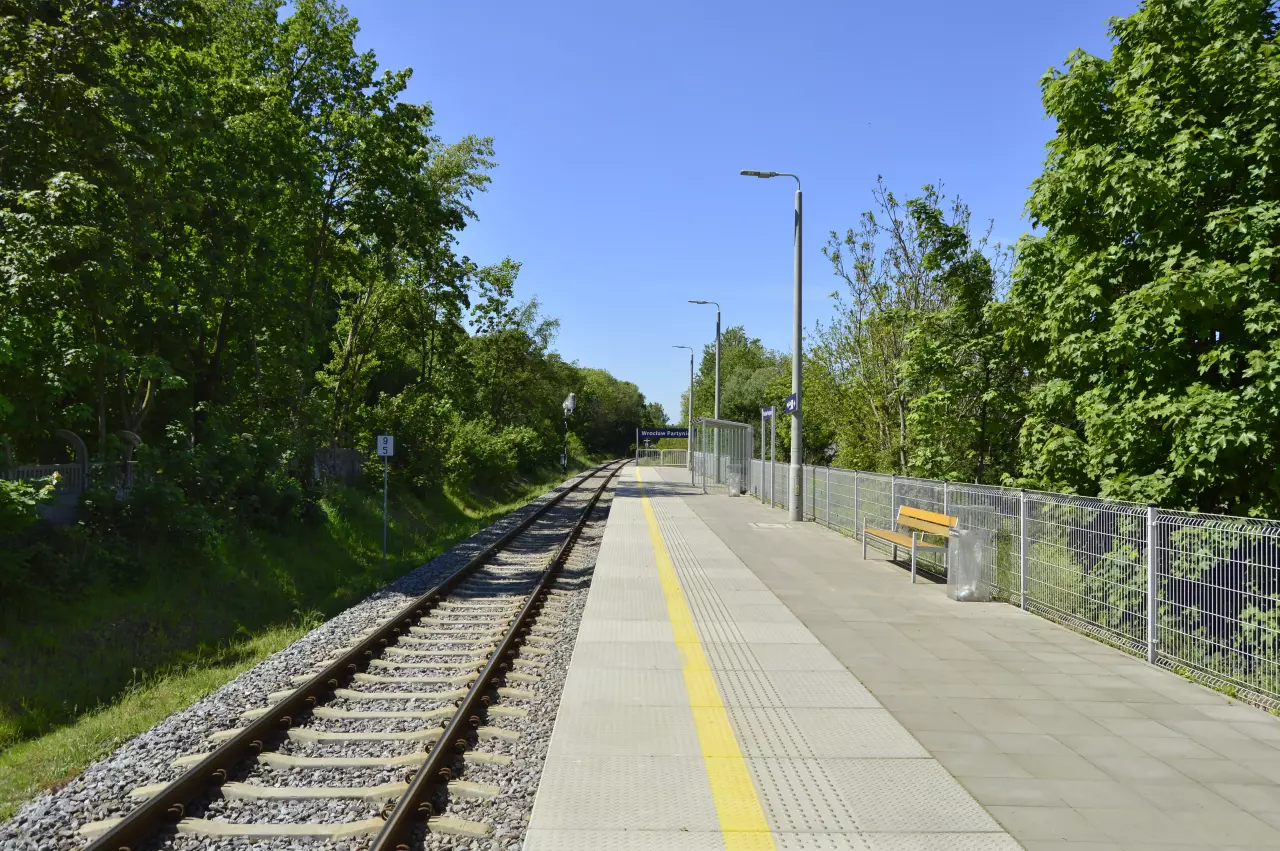 2021: Przystanek budowany na nowo w ramach rewitalizacji linii. Istnienie przystanku wynika z niemieckich map (przynajmniej od 1916 roku), wykazu nazw z roku 1945, oraz z polskiej mapki z 1946. W żadnym rozkładzie jazdy nie udało mi się odnotować działalności. Jeżeli kiedykolwiek na tej linii mogła być stacja Breslau Rennplatz (czyli Wrocław Tor Wyścigowy) inna niż na kilometrze 8,5 (czyli przy Ołtaszyńskiej), to mogła być ona tylko w jednym miejscu: obok przecięcia ulicy Zwycięskiej/Jeździeckiej z torami (kilometr 9,4), na tyłach hipodromu, na zachód od ulicy (mapy to potwierdzają). To, co tam się w tej chwili znajduje sprawia wrażenie pozostałości po dawnym peronie, a lokalizacja jest idealna dla osób, które chciałyby przyjechać tu po to, aby oglądać wyścigi konne (ze stacji Hartlieb, czyli "Batonice" dojście byłoby zbyt niewygodne i na pewno nieodpowiednie dla dam i dżentelmenów. Przypuszczam że ów przystanek Rennplatz mógł być wykorzystywany jedynie podczas zawodów na torze wyścigowym. (info: Julo). |