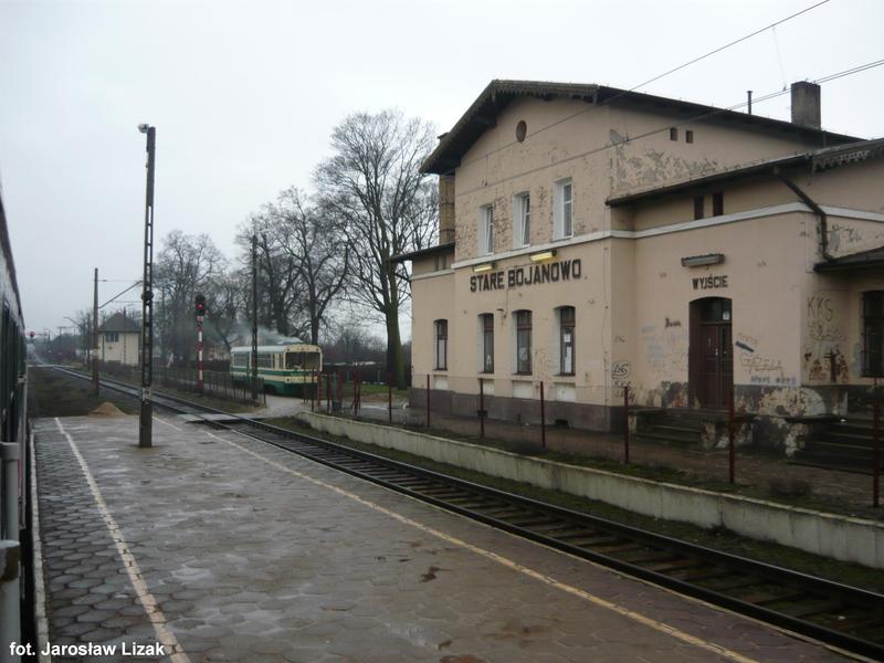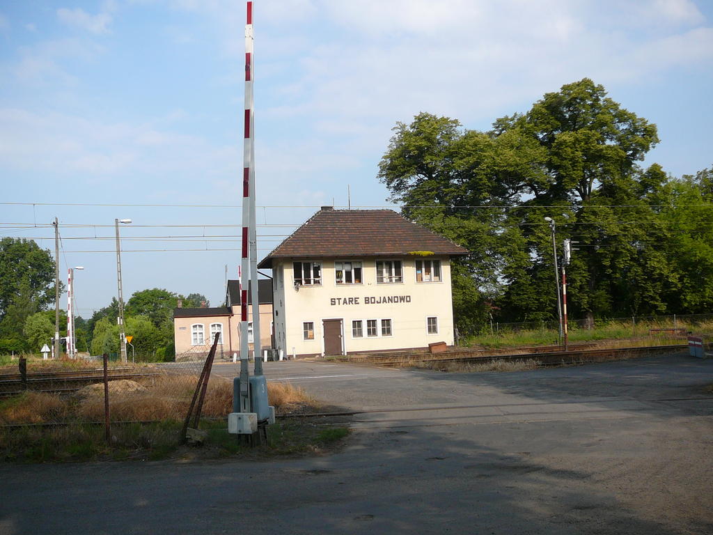 Stacja Stare Bojanowo - budynek stacyjny, widoczny słupek hektometrowy - km 112,5 linii nr 271 Wrocław Główny - Poznań Główny, w lewo - kierunek Leszno (Wrocław Główny), w prawo - kierunek Kościan (Poznań Główny).