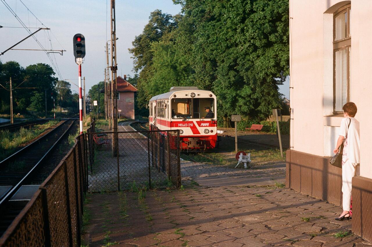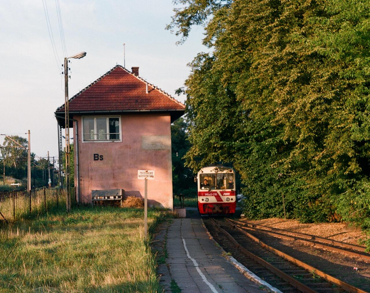 Stacja Stare Bojanowo Wąskotorowe (grupa pasażerska) - wjazd pociągu MM 7511 relacji Śniaty - Stare Bojanowo Wąskotorowe, obsługiwanego wagonem spalinowym MBxd2-218. Widok w kierunku stacji Wielichowo (Rakoniewice Wąskotorowe). Widoczny budynek nastawni dysponującej "Bs" stacji normalnotorowej Stare Bojanowo - widok w kierunku stacji Leszno (Wrocław Główny).