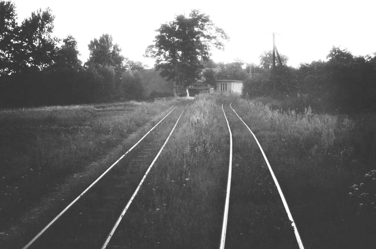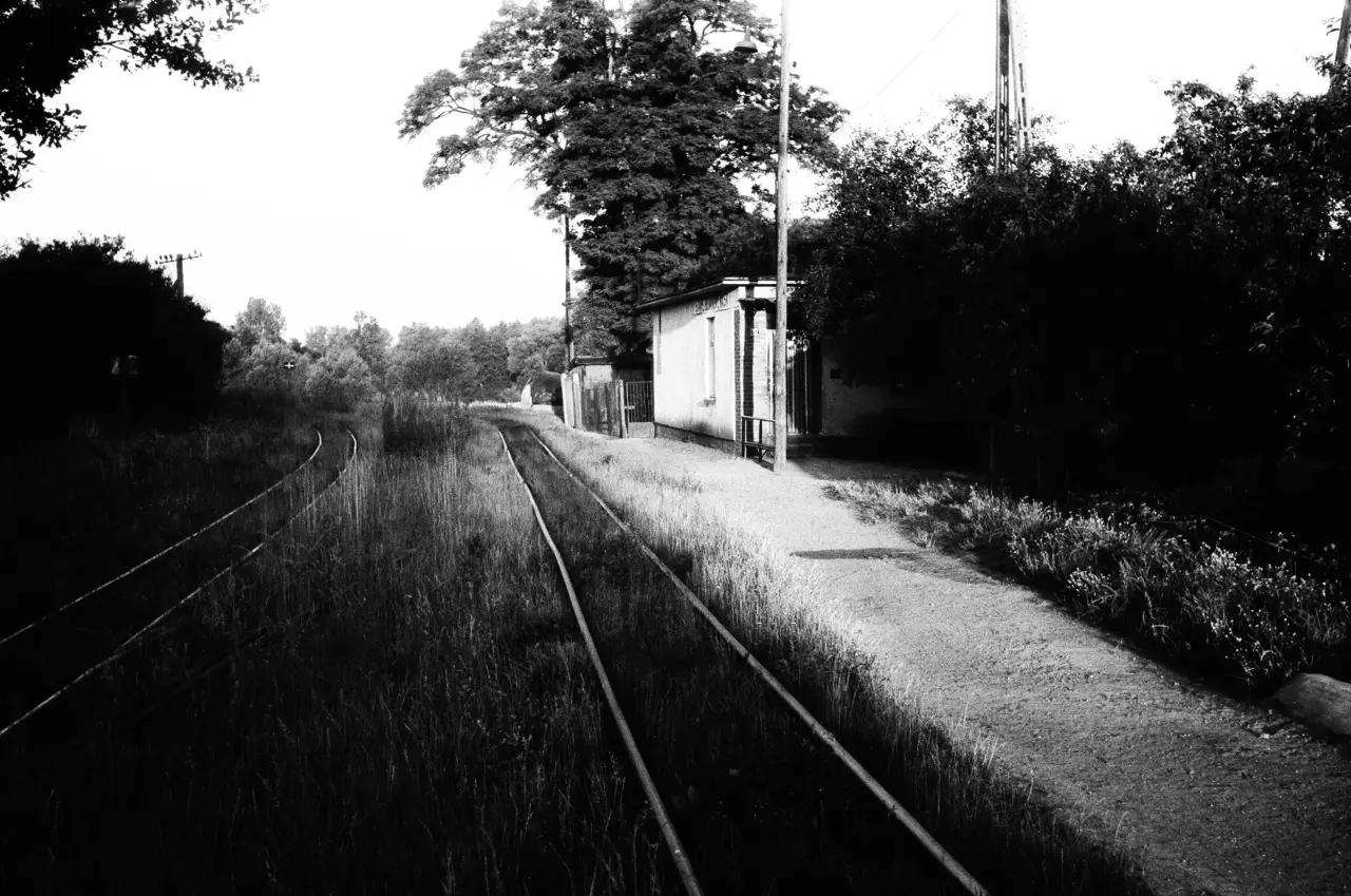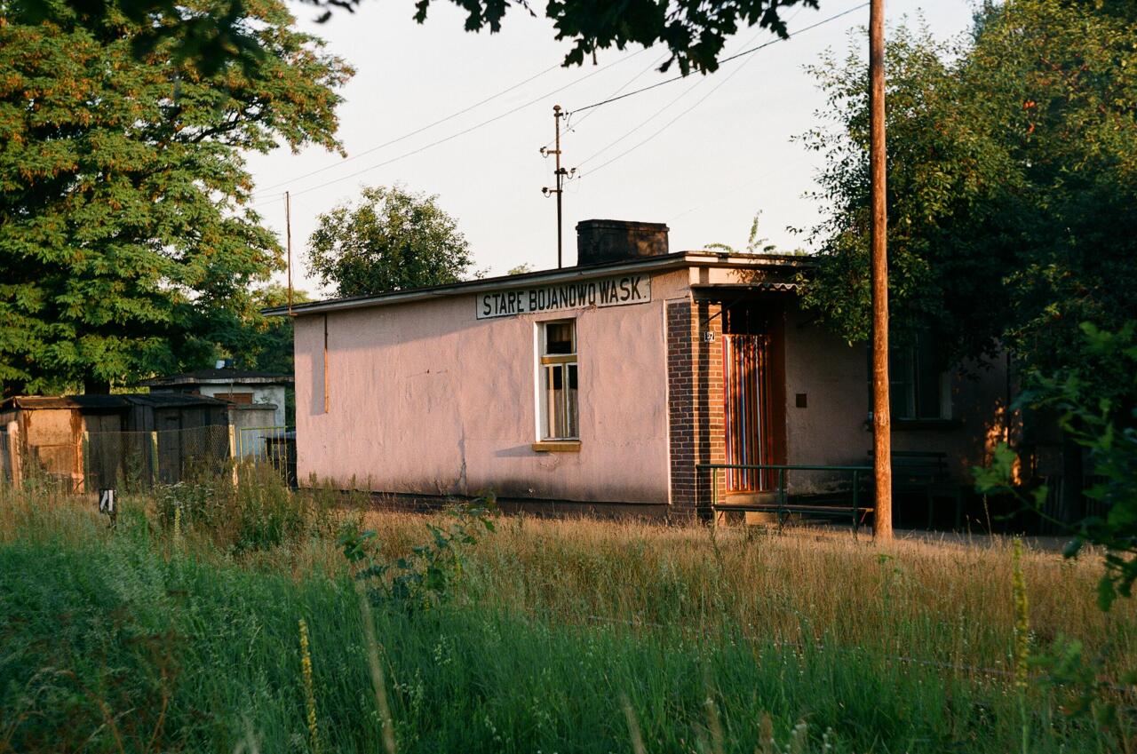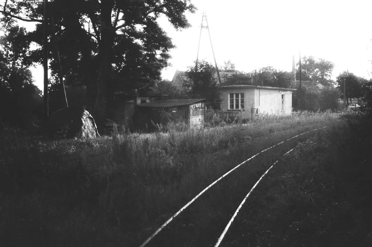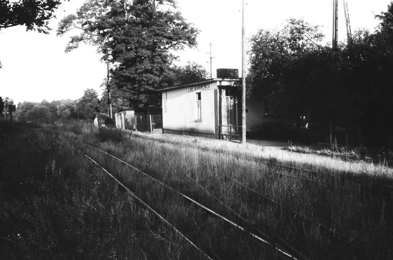 Stacja Stare Bojanowo Wąskotorowe - budynek stacyjny, budynki towarzyszące, zarośnięty peron (na międzytorzu, za łącznikiem rozjazdowym), widok w kierunku stacji Wielichowo (Rakoniewice Wąskotorowe).