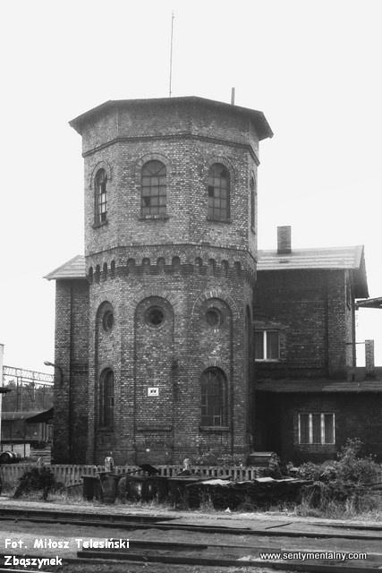 Lokomotywownia w Rzepinie, za budynkiem widoczny górny fragment wieży ciśnień. Obiekty położone po południowej stronie dworca (z lewej, za plecami). Widok w kierunku południowo-wschodnim.