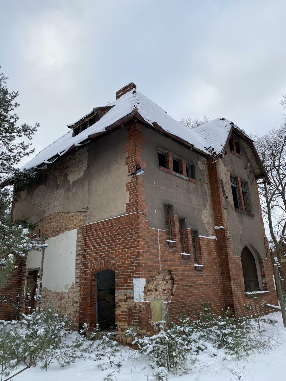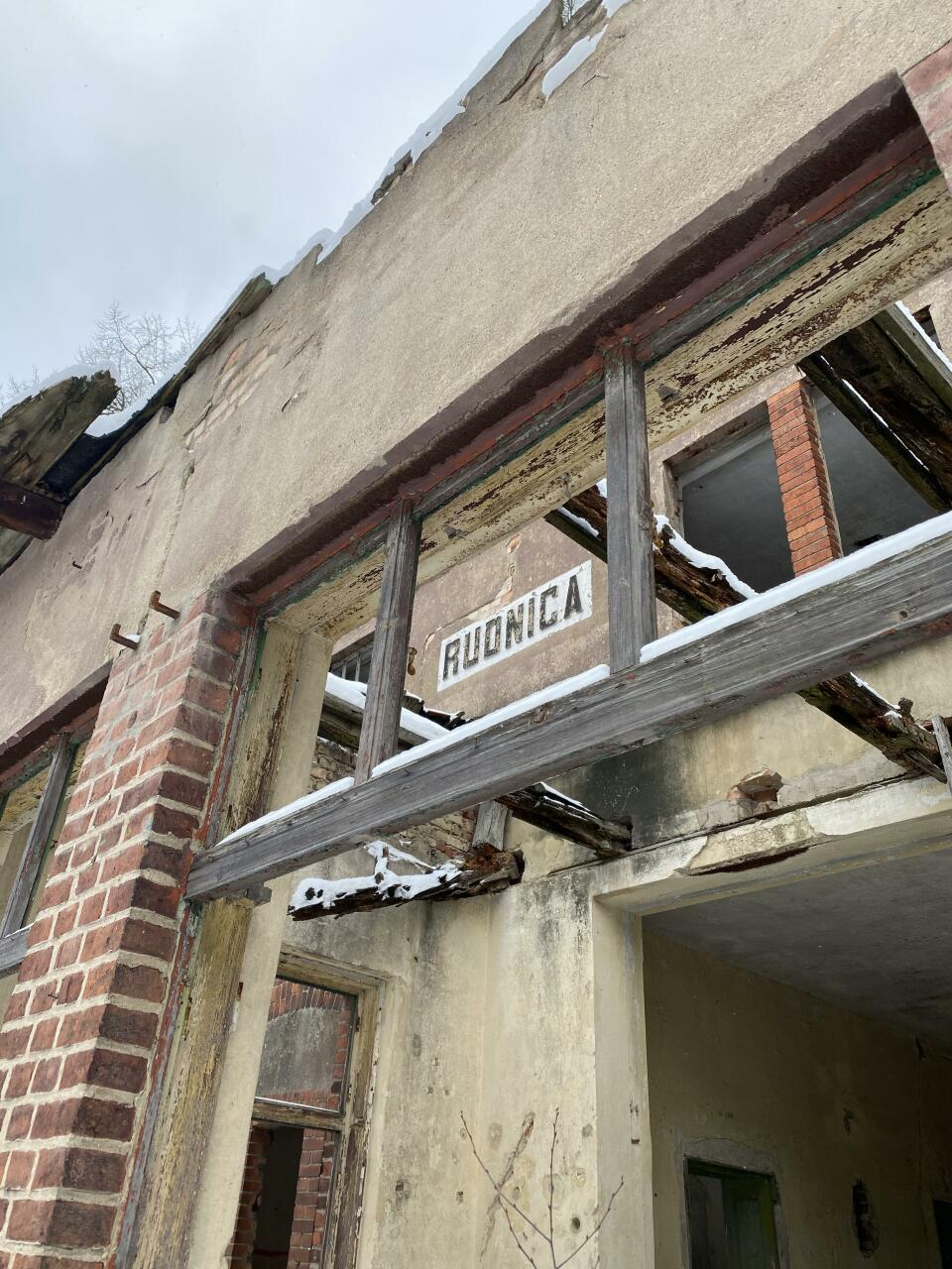 Rudnica, zdewastowany dworzec kolejowy z przybudówką nastawni.