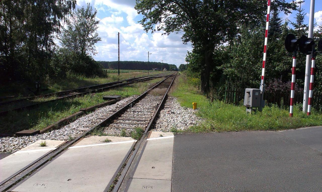 Przejazd kolejowy przy nastawni od strony Głogowa na drodze gminnej w Nowych Drzewcach. Widok w kierunku Starych Drzewców. W lewo perony, w prawo Grodziec Mały/Głogów.