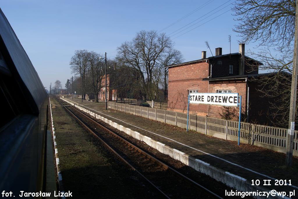 Stare Drzewce. Widok na stację z odjeżdżającego pociągu relacji Głogów - Leszno, w kierunku południowo-zachodnim (Grodziec Mały/Głogów).