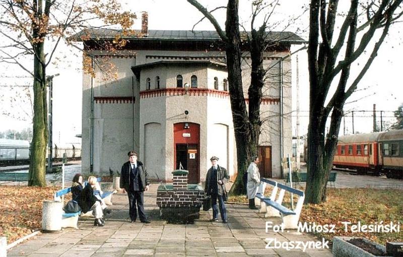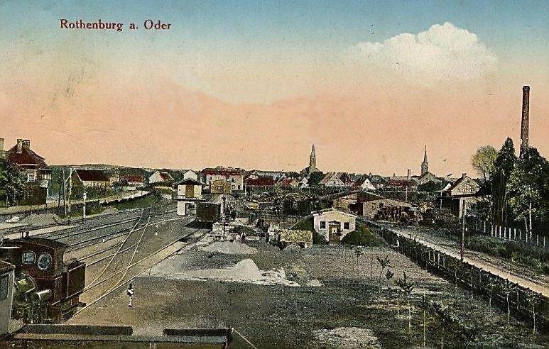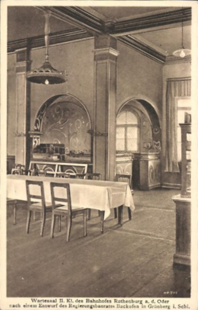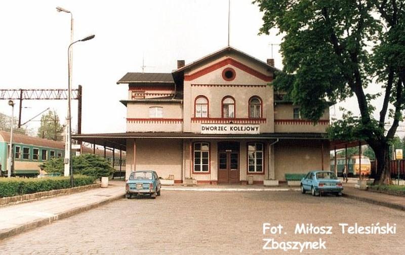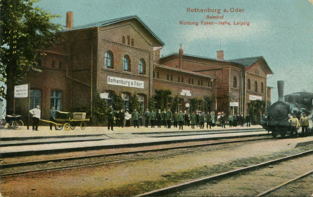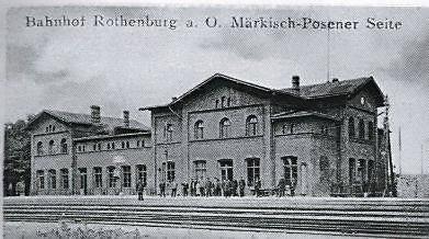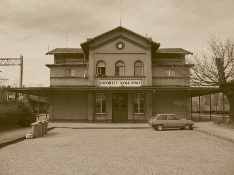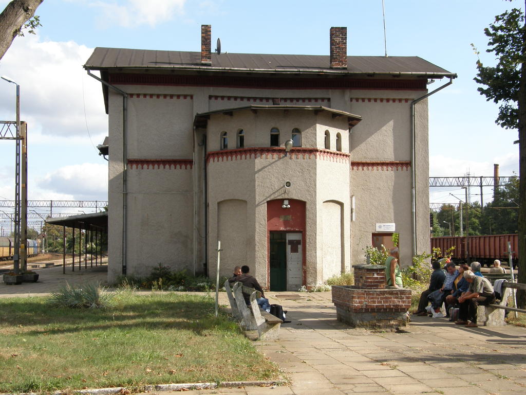 Budynek dworca od strony zachodniej. Biuro dyżurnego ruchu na wprost. Kiedyś było tam wejście do poczekalni, gdzie na lewo do poczekalni drugiej klasy na na prawo do wyższej. Po jego prawej stronie perony 3 i 4 (południowe), dedykowane dla ruchu po lk 358. Po jego lewej stronie perony 1 i 2 (północne), dedykowane dla ruchu po lk 273. Widok w kierunku wschodnim, od strony wjazdów z Krosna Odrzańskiego/Guben i Rzepina.