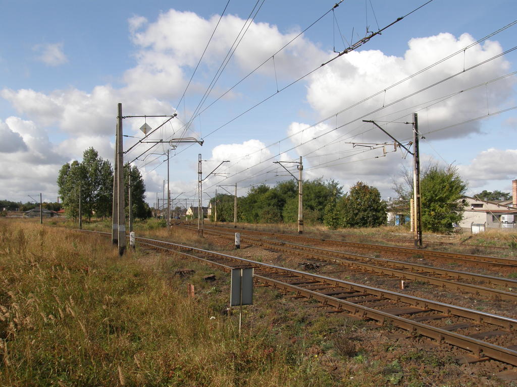 W tym miejscu od linii 273 odgałęzia się jednotorowa łącznica umożliwiająca przejazd na południową stronę stacji, gdzie przebiega linia 358. Widok w kierunku zachodnim, od strony wjazdu z Zielonej Góry. 165,8 km/0,0 km.