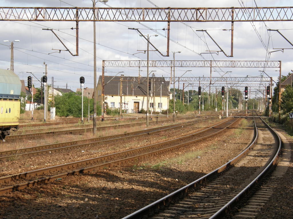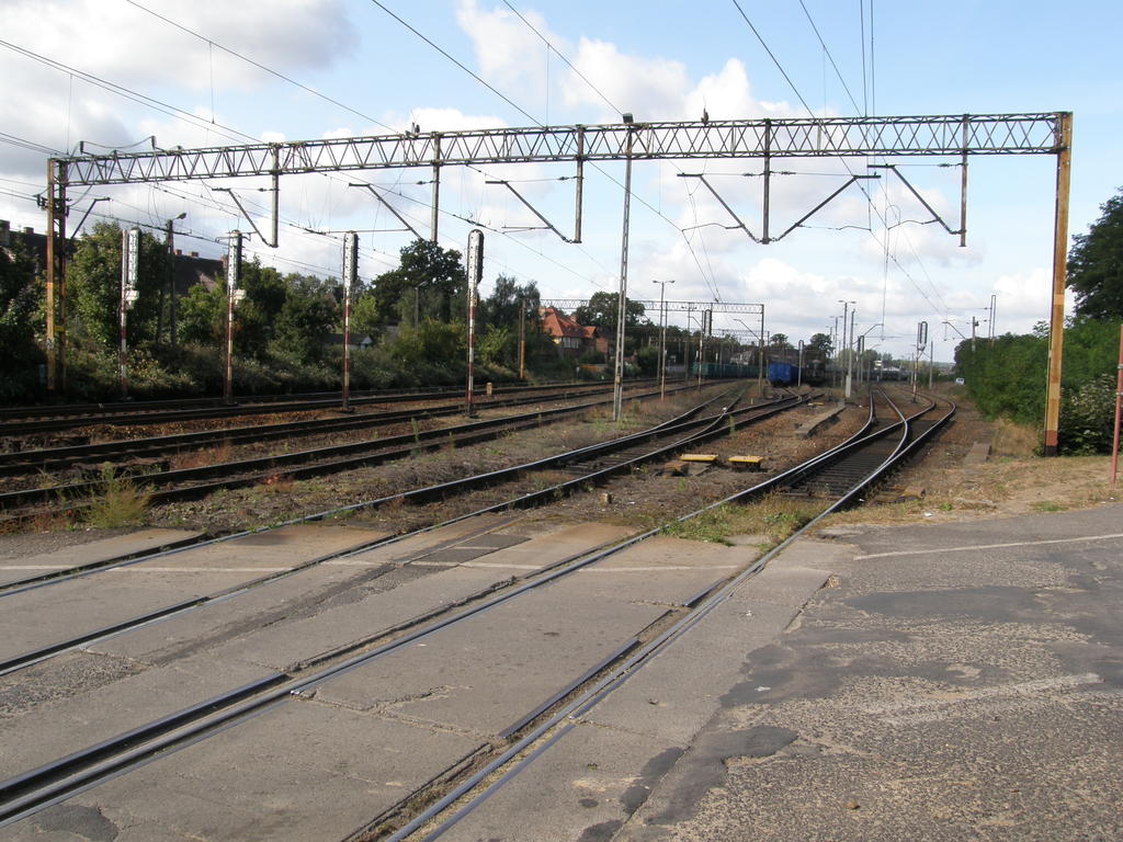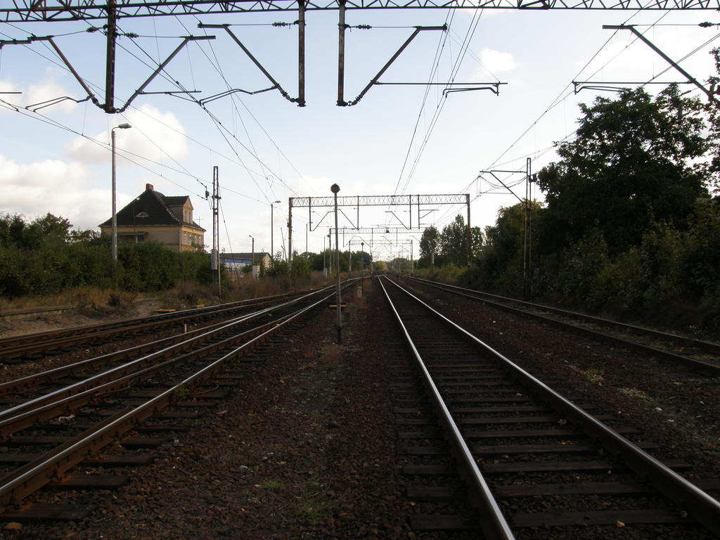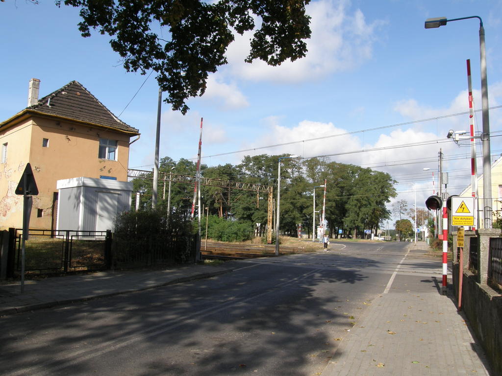 Wschodnia głowica stacji na północnej grupie torów, z przejazdem kolejowym przez ulicę Kwiatową. Widoczna dawna nastawnia. W oddali następny przejazd przez południową grupę torów. Widok w kierunku południowym; w lewo Zielona Góra (północna i południowa grupa torów) i Sulechów (południowa grupa torów), w prawo perony. 166,1 km.