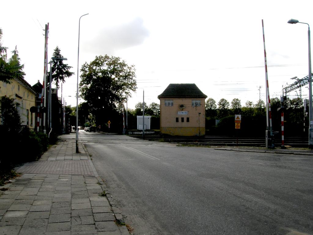 Dawna nastawnia a z lewej fragment przejazdu drogowego w ciągu ulicy Kwiatowej, przez północną grupę torów. Widok w kierunku południowym; w lewo Zielona Góra, w prawo perony. 166,1 km.