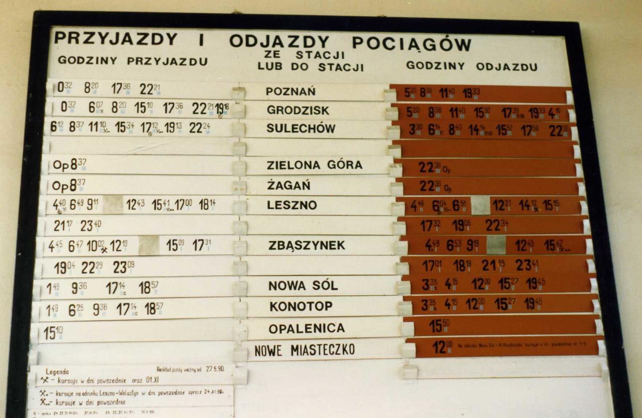 Prawdziwy smaczek - imponująca tablica odjazdów i przyjazdów w Wolsztynie w maju 1991. Obecnie wyglądałaby ona o wiele skromniej. Nie pojedziemy już stąd bezpośrednio do Nowej Soli (choć władze lokalne wyrażają chęć zrobienia tam przewozów turystycznych) czy Sulechowa przez Kargową (rozbiórka torów), gdzie wtedy jeździło aż 7 par pociągów pasażerskich! Na uwagę zasługują także relacje do Żagania (przez Zieloną Górę), do Opalenicy (przez Grodzisk Wielkopolski) oraz do Nowego Miasteczka (przez Nową Sól).