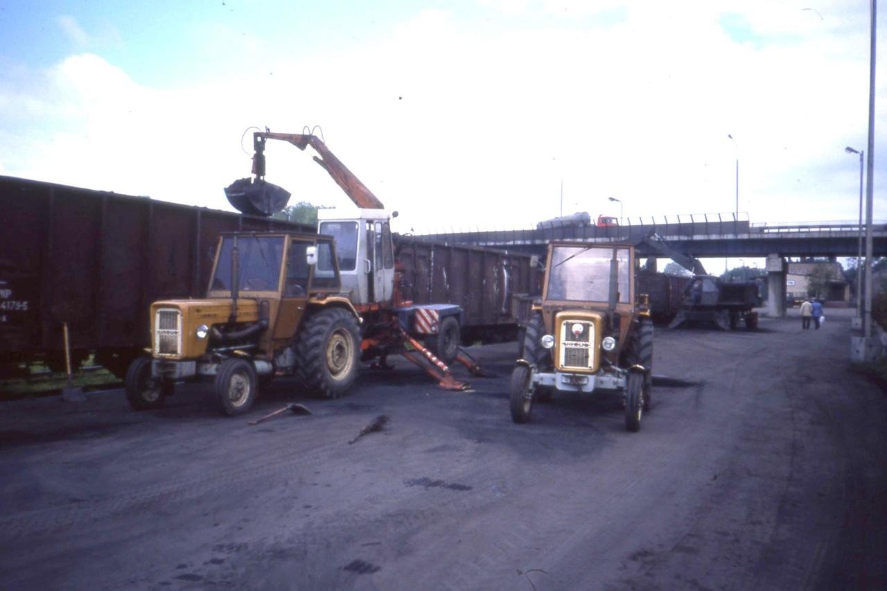 Przeładunek węgla z wagonu na przyczepę na wolsztyńskim placu ładunkowym we wschodniej części stacji. Na drugim planie wiadukt, za nim zabudowania dworcowe. Obecnie przybycie i nadanie ładunków w Wolsztynie jest raczej symboliczne. Widok od strony wjazdów z Leszna, Kolska/Nowej Soli i Grodziska Wielkopolskiego/Poznania. Kierunek północno-zachodni.
