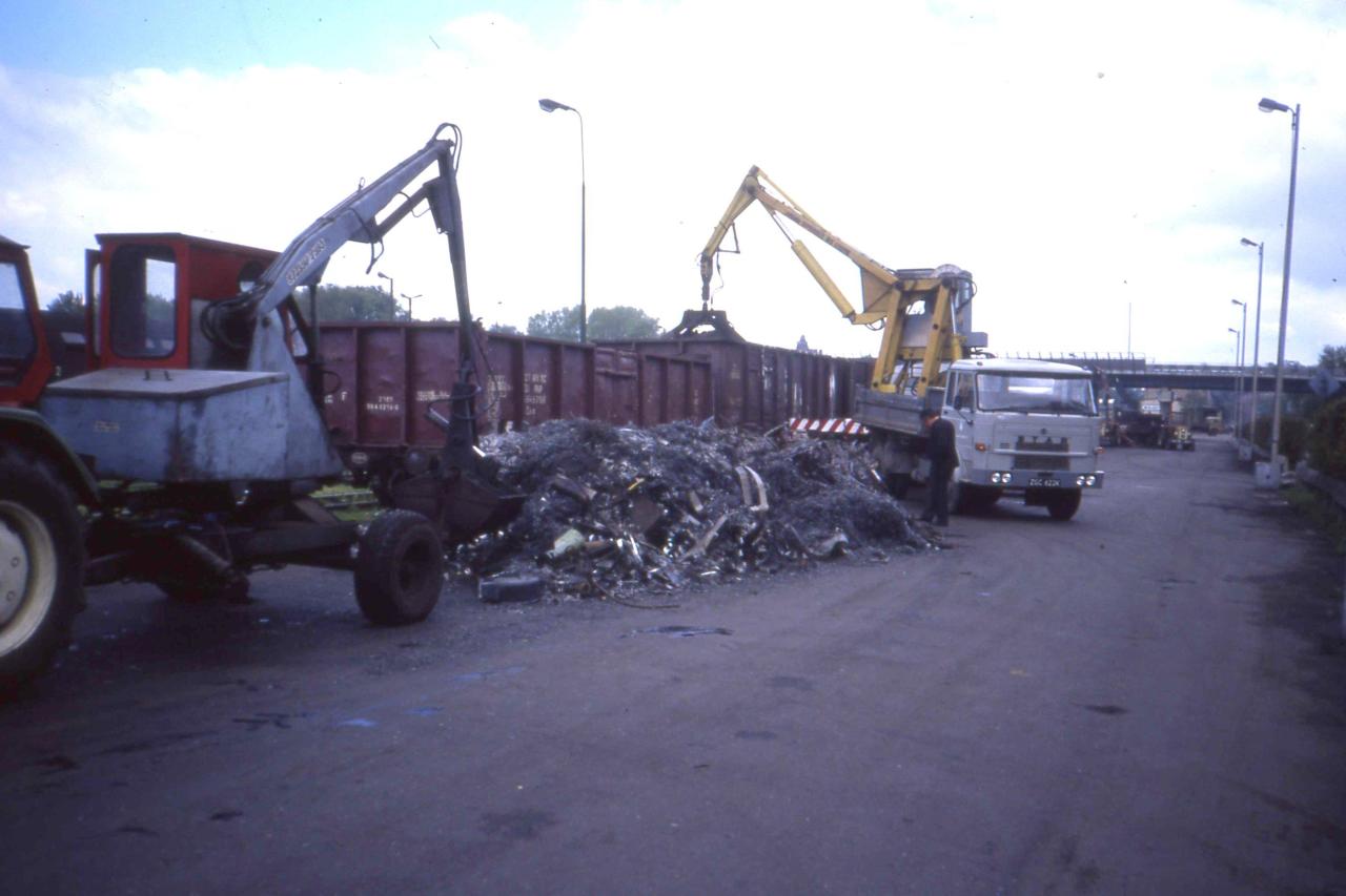 Załadunek złomu na wagony stojące na wolsztyńskim placu ładunkowym we wschodniej części stacji. Na drugim planie wiadukt, za nim zabudowania dworcowe. Obecnie przybycie i nadanie ładunków w Wolsztynie jest raczej symboliczne. Widok od strony wjazdów z Leszna, Kolska/Nowej Soli i Grodziska Wielkopolskiego/Poznania. Kierunek północno-zachodni.