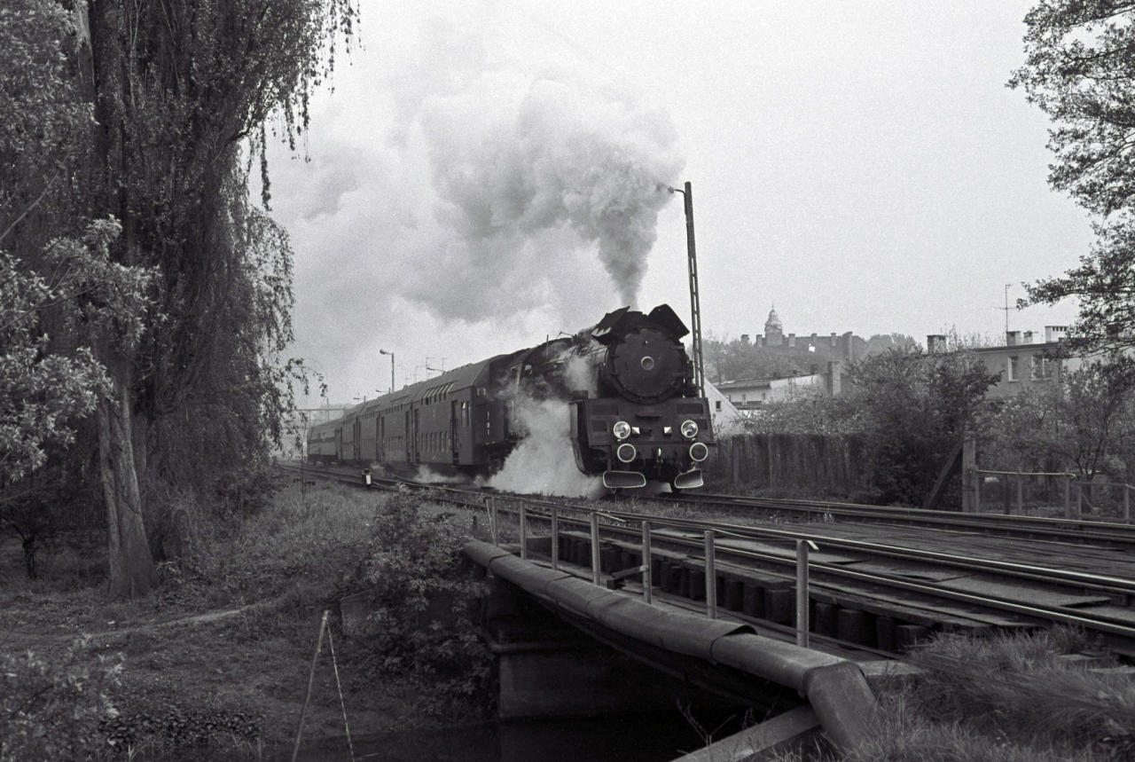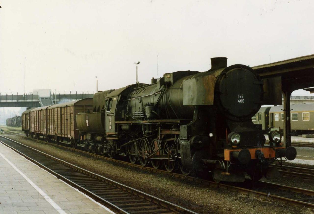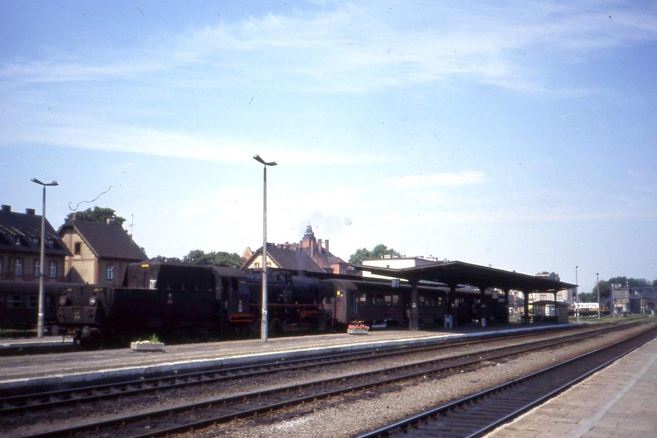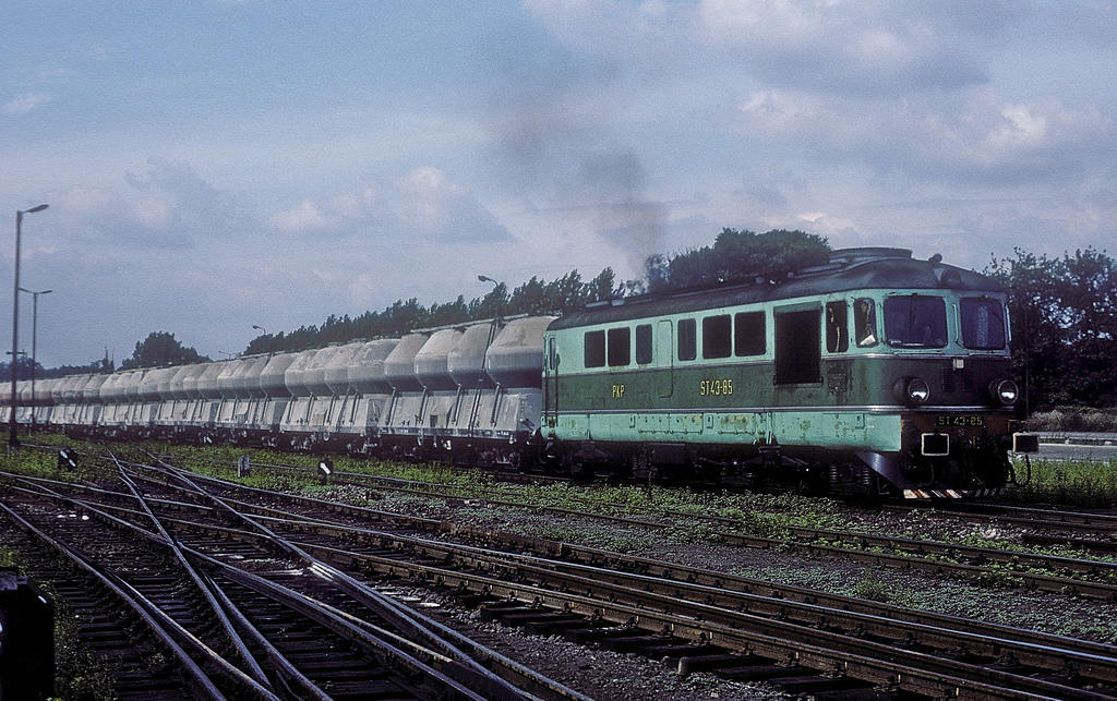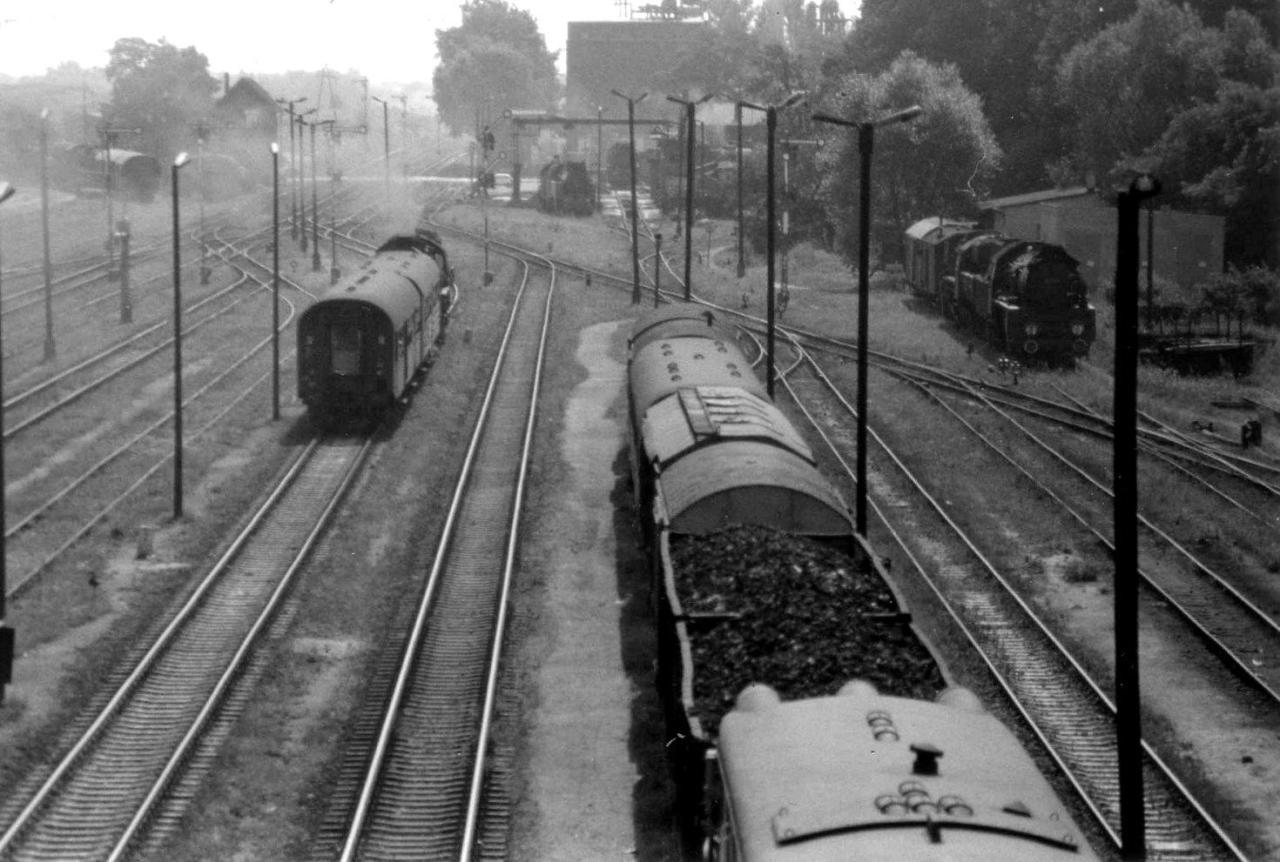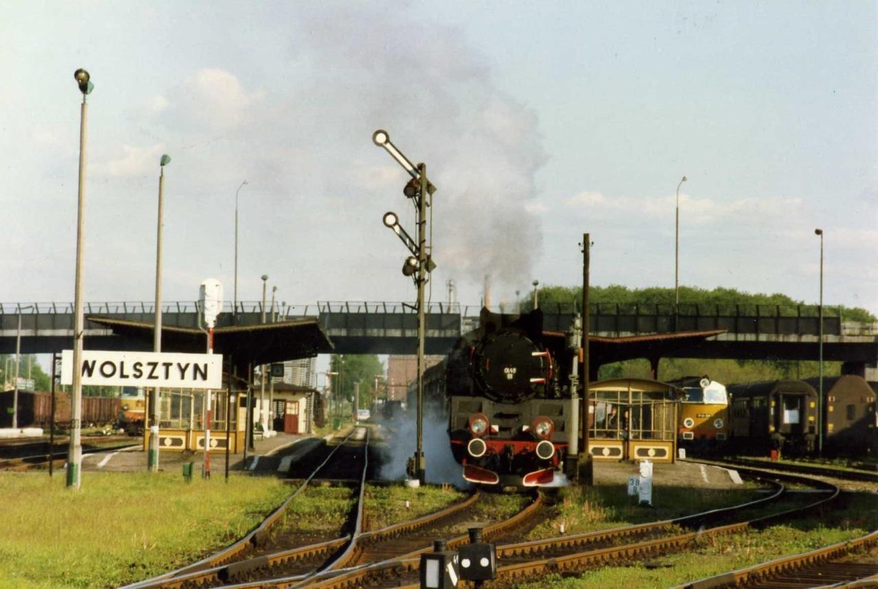 Ciężki pociąg towarowy wtacza się na rampę w Wolsztynie; dziś taki obraz należy tu do rzadkości. Widok od strony wjazdów z Leszna, Kolska/Nowej Soli i Grodziska Wielkopolskiego/Poznania, w kierunku północnym.