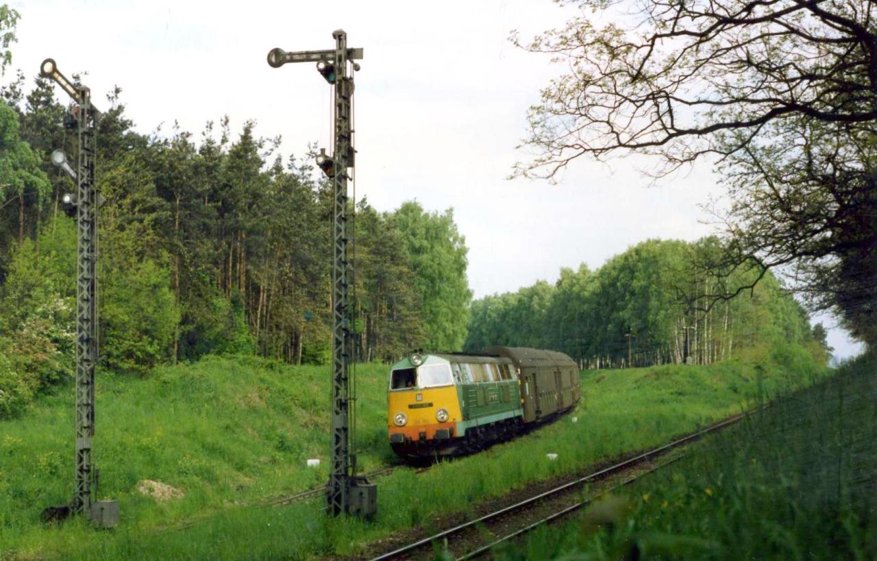 Pociąg z Leszna do Zbąszynka. Wierzyć się nie chce, patrząc na obecne szynobusy lub dwuczłonowe spalinowe zestawy trakcyjne, że jeszcze ćwierć wieku temu na drugorzędnej linii jeździł skład zestawiony z podwójnej Bipy! Widok od strony Sulechowa i Zbąszynia/Zbąszynka, w kierunku południowo-wschodnim.