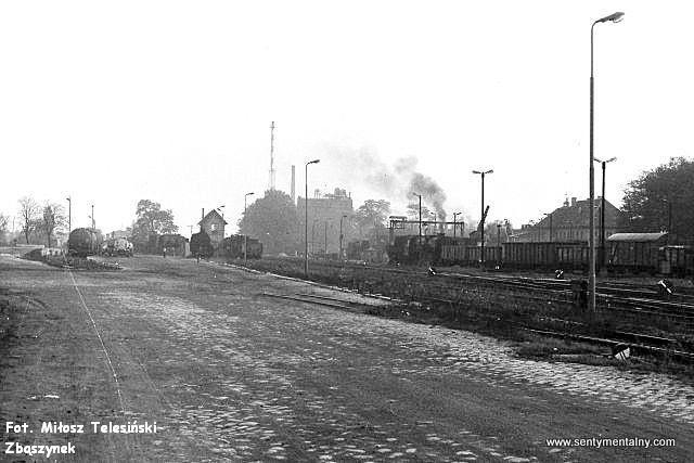 Plac ładunkowy (stacyjny), dalej po prawej stronie lokomotywownia. Widok w kierunku południowo-wschodnim (Leszno, Grodzisk Wielkopolski/Poznań, Kolsko/Nowa Sól).