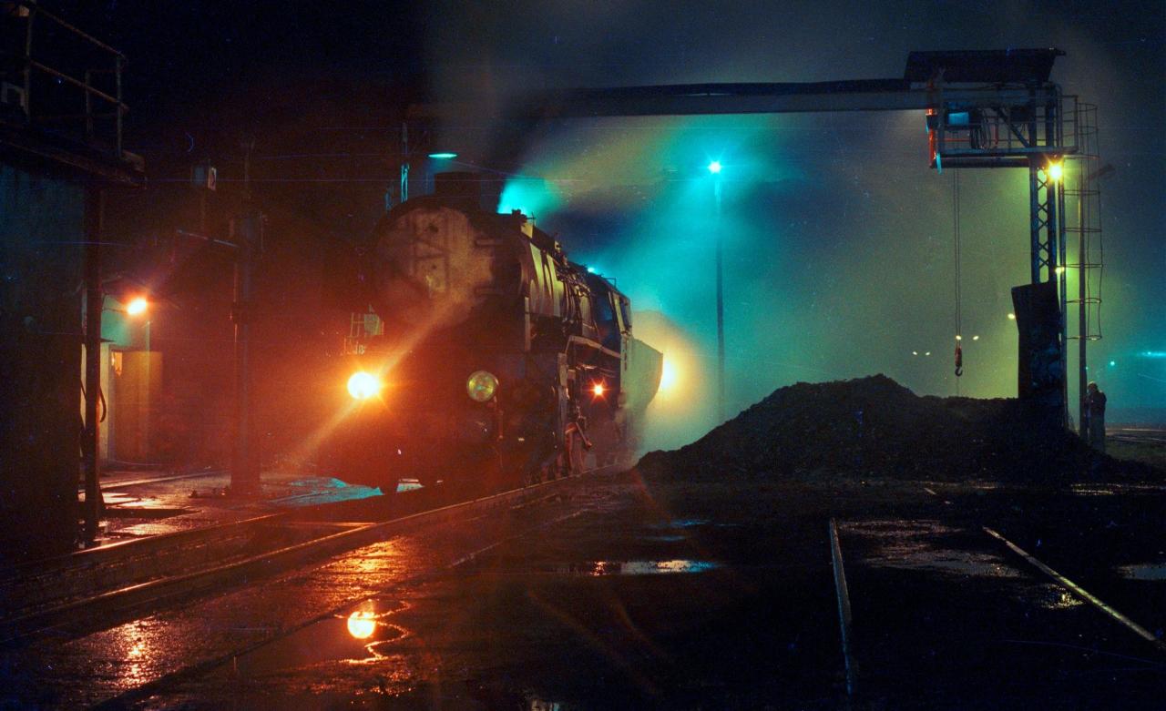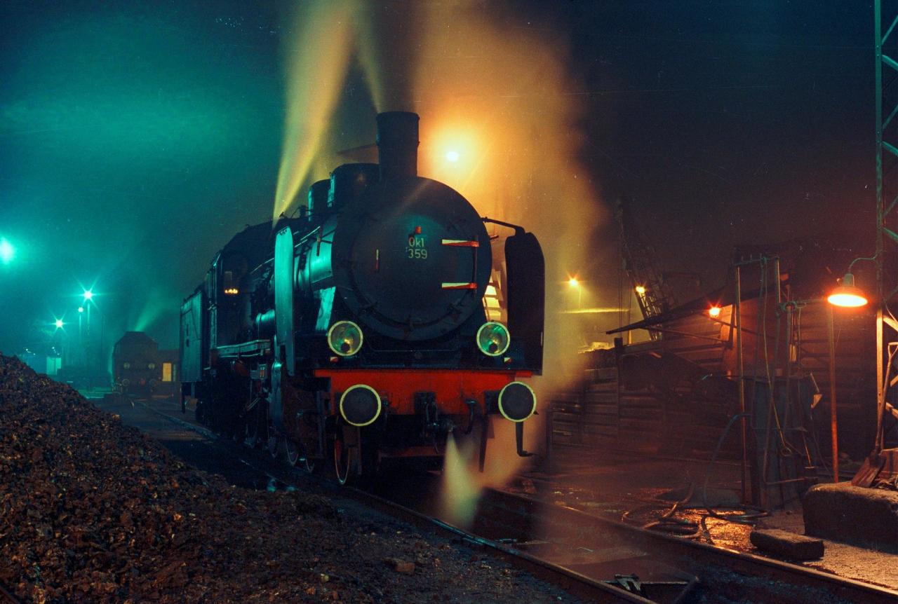 Późnowieczorne obrządzanie parowozu Ok1 na terenie szopy w Wolsztynie. Zrzucanie popiołu do kanału oczystkowego.