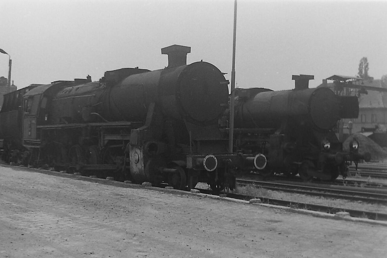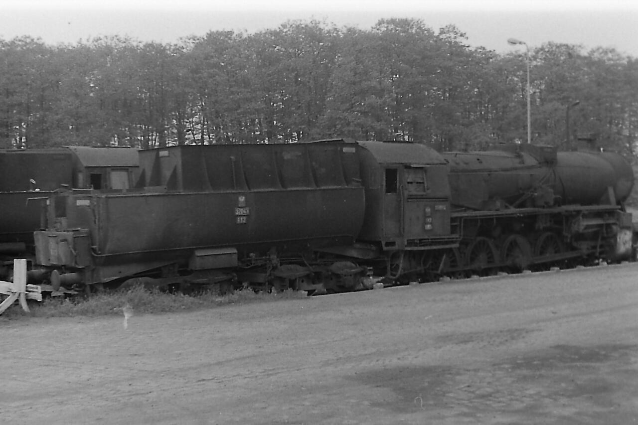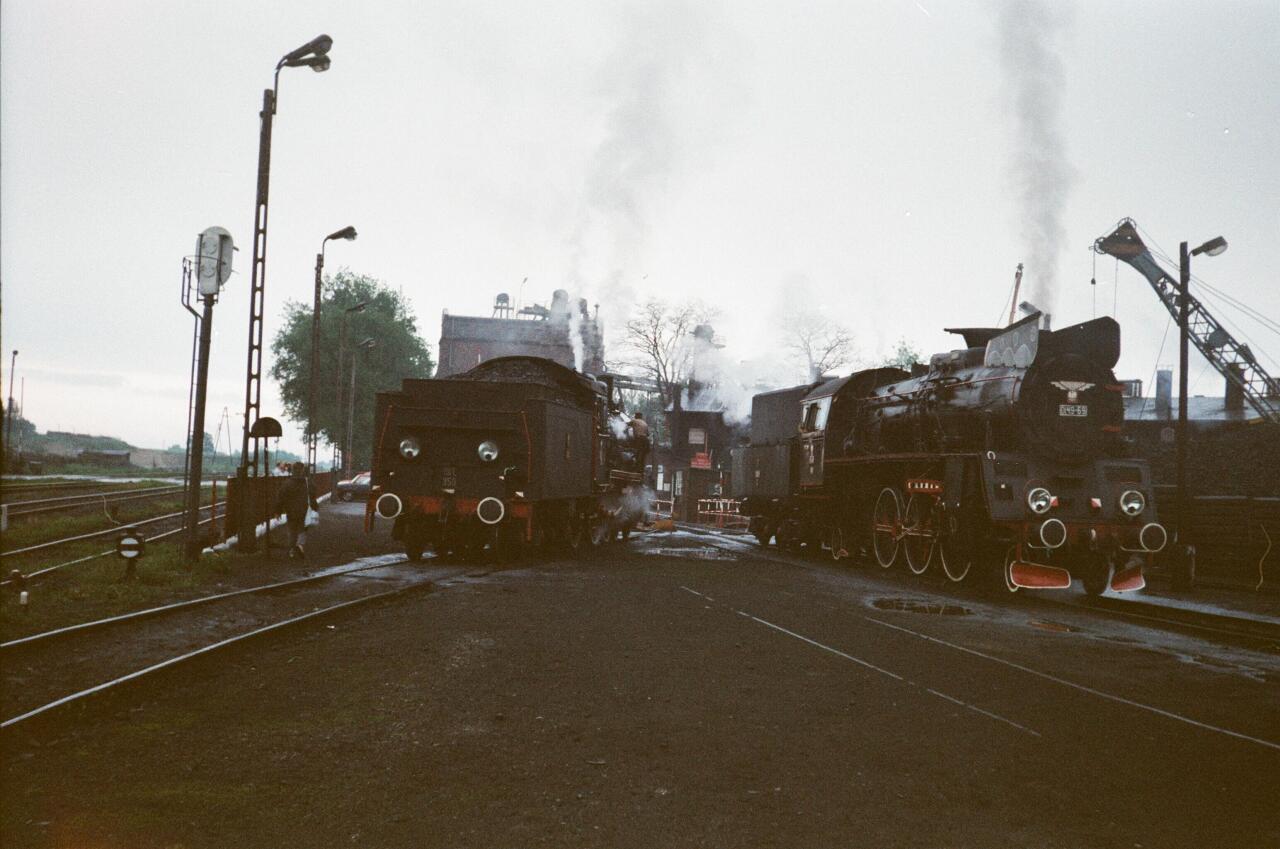 Stacja Wolsztyn (parowozownia) - parowóz Ol49-59 (MD Wolsztyn) na torze 34a, z prawej parowóz Pt47-65 (MD Wolsztyn). Widok w kierunku stacji Grodzisk Wielkopolski (Luboń koło Poznania), Leszno, Kolsko (Żagań).