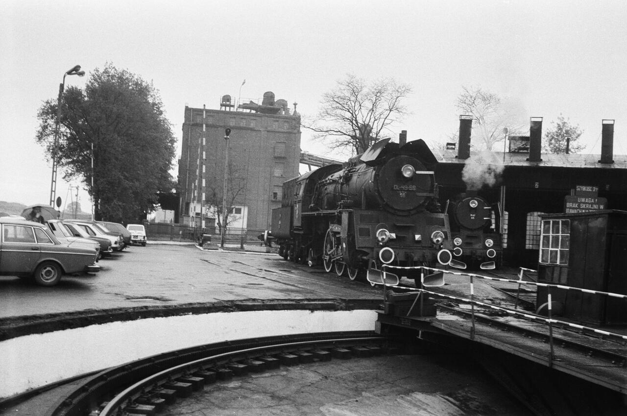 Stacja Wolsztyn (parowozownia) - parowóz Ok1-359 na torze 28, parowóz Ol49-69 na torze 34 (kanał rewizyjny), widoczna obrotnica. Widok w kierunku stacji Leszna, Grodziska Wielkopolskiego, Kolska (południowy-wschód).