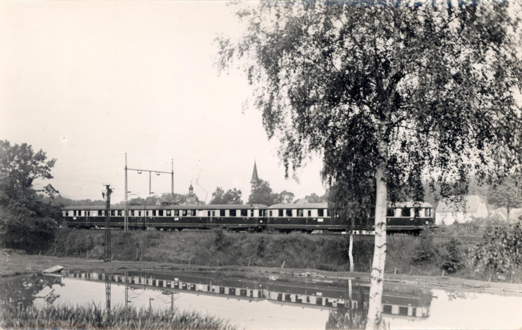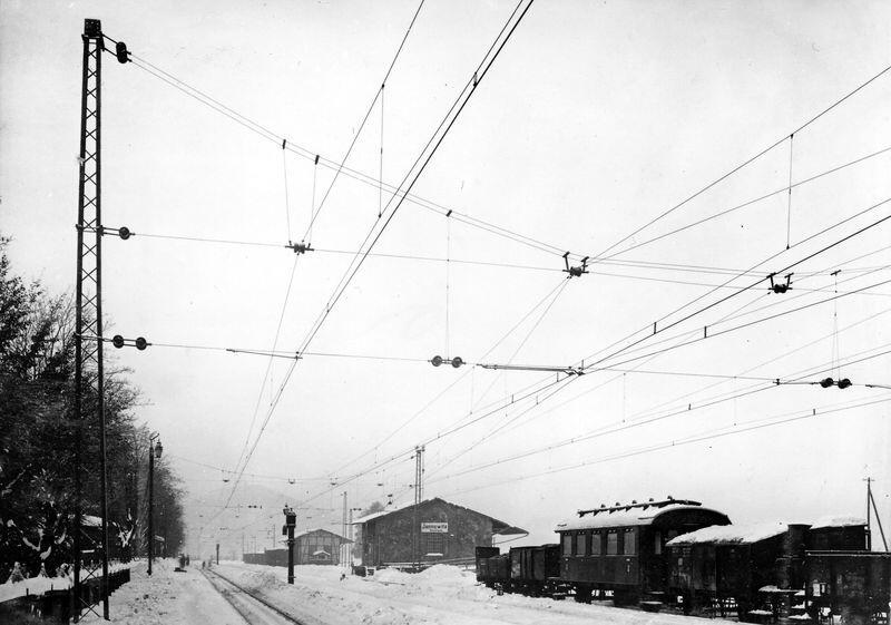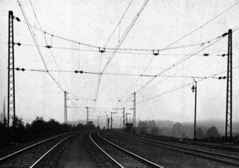 Ze strony http://www.zackenbahn.de/elektrifizierung.html (Siemens Corporate Archive). W tle magazyn towarowy. Widok w kierunku Jeleniej Góry.