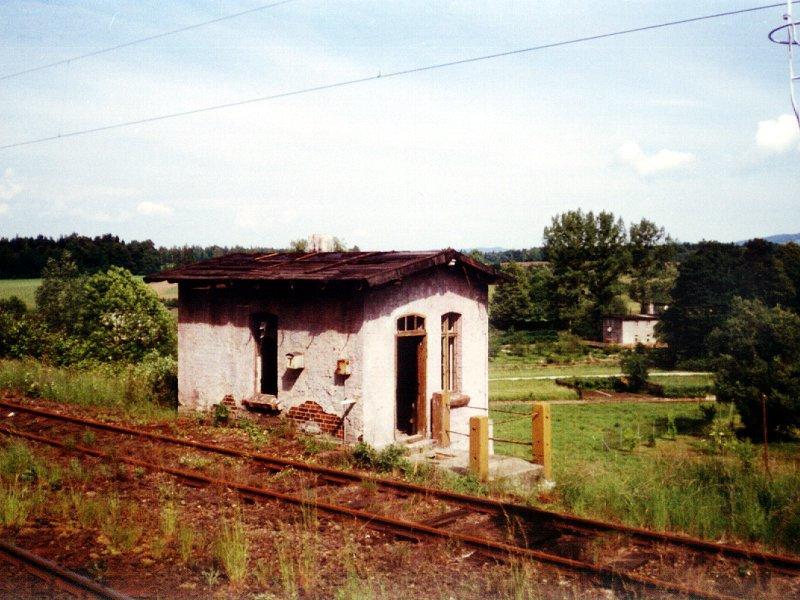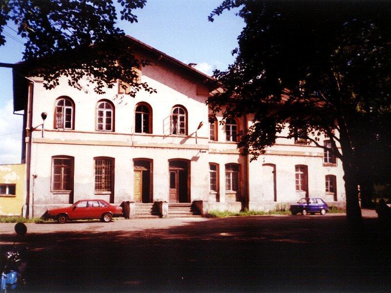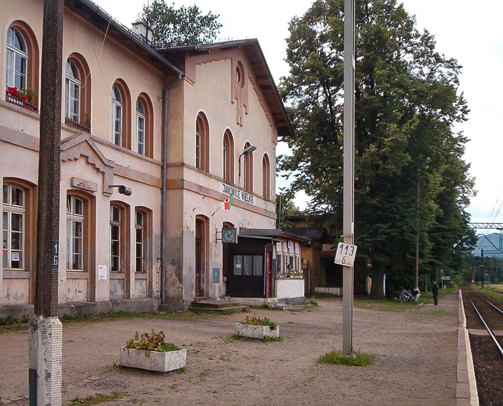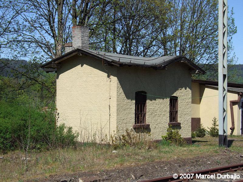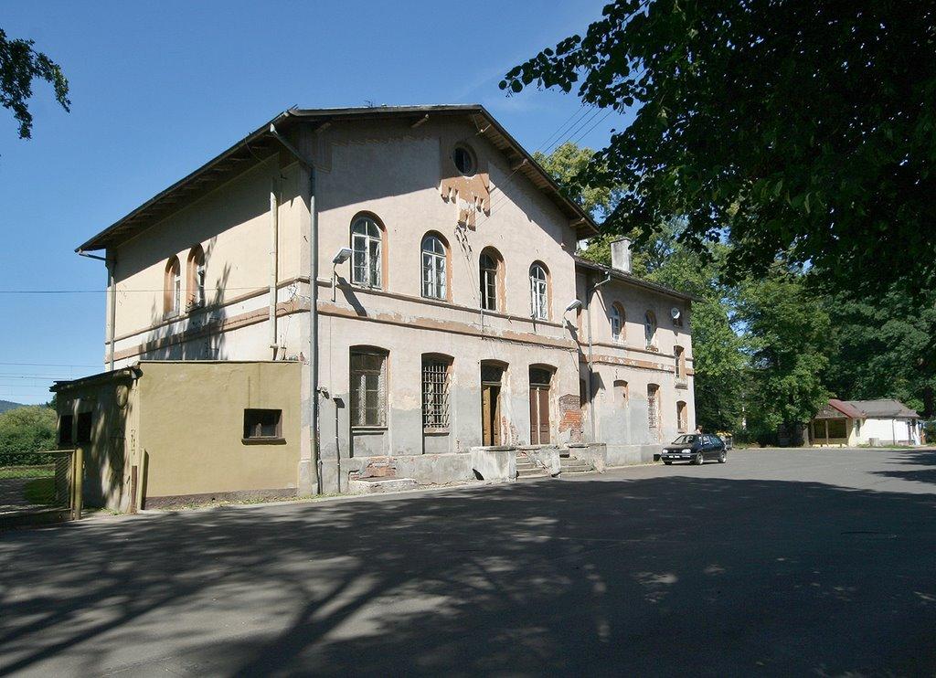 Janowice Wielkie. Budynek automatyków PLK. Widok w kierunku północno-wschodnim; w lewo Jelenia Góra, w prawo perony.