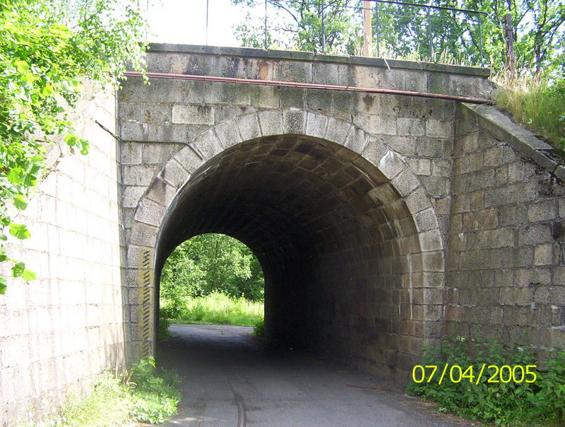 Wiadukt w zachodniej części stacji - w asfalcie fragmenty szyn, prawdopodobnie kursowała tu kolejka do rampy towarowej przy stacji. W prawo perony, w lewo Jelenia Góra.