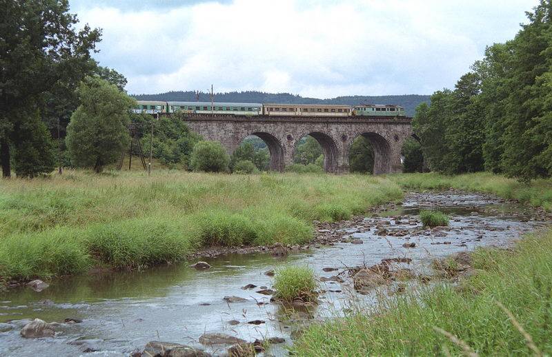 Pociąg pośpieszny w kierunku Wrocławia na moście kolejowym nad rzeką Bóbr. Zdjęcie wykonane z terenu dawnej papierni. Widok w kierunku północnym; w prawo perony/Wrocław, w lewo Jelenia Góra.