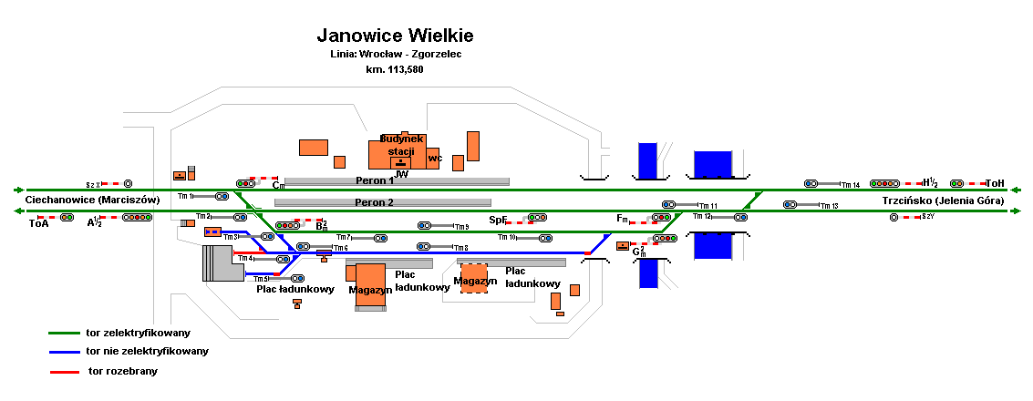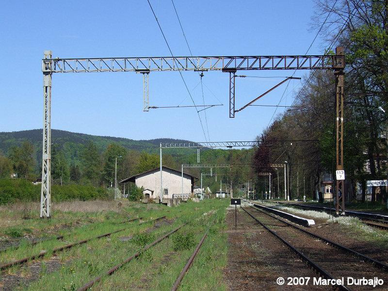 Janowice Wielkie. Widok na perony od strony wjazdu z Jeleniej Góry. W tle magazyn towarowy z rampą. Nogi bramki to poniemieckie konstrukcje wsporcze. Warto także zwrócić uwagę na rodzaj sieci jezdnej, dla toru po lewej - półskompensowana, dla toru po prawej - skompensowana.