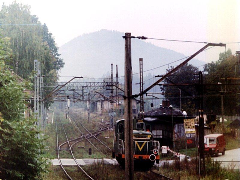 Widok ogólny stacji od strony wjazdu z Marciszowa/Wałbrzycha. Na pierwszym planie chyba SM30 z Marciszowa. Maszyna przejeżdża przez przejazd kolejowy na ul. Karola Świerczewskiego. W głębi widoczne są perony i Góry Sokole.