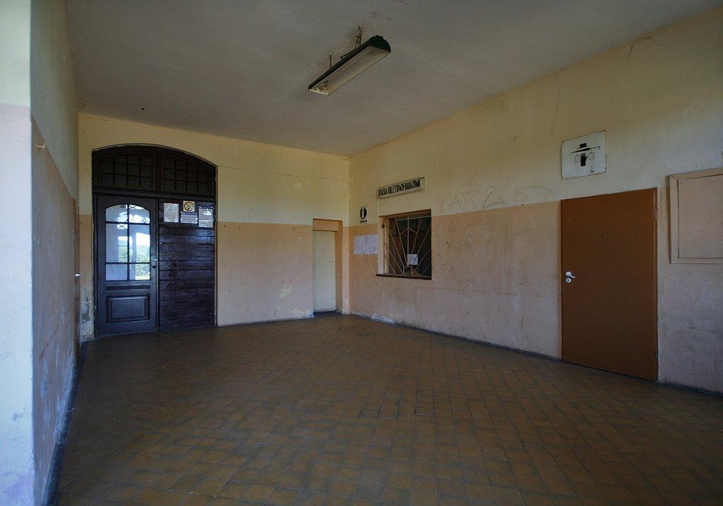 Poczekalnia w budynku dworca. Z prawej nieczynne okienko kasowe.