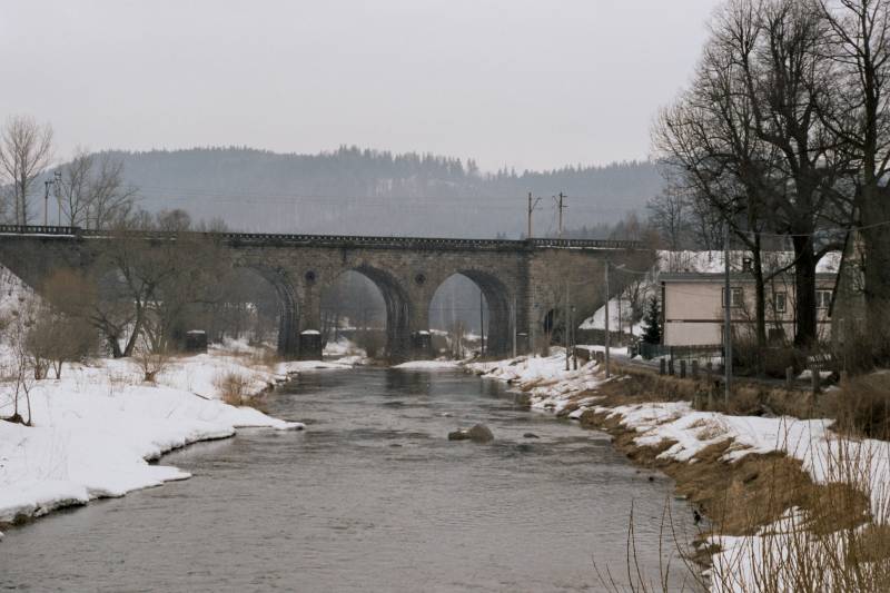 Zachodni most kolejowy nad Bobrem. Widok w kierunku południowym; w prawo Jelenia Góra, w lewo perony.