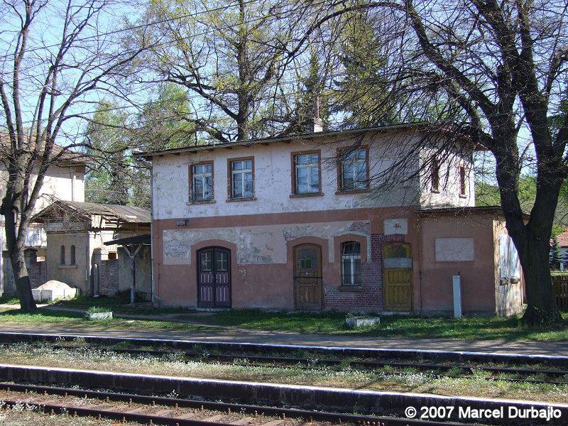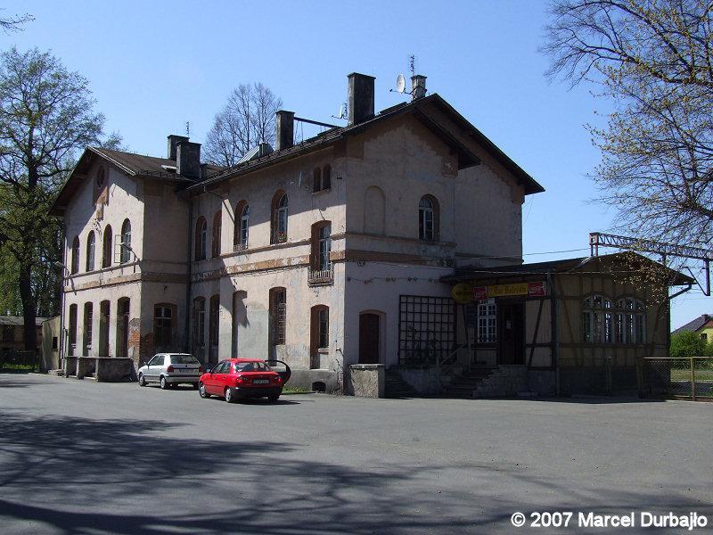 Budynek dworca od strony peronów i wjazdu z Marciszowa. Na parterze mieści się w nim nastawnia dysponująca.
