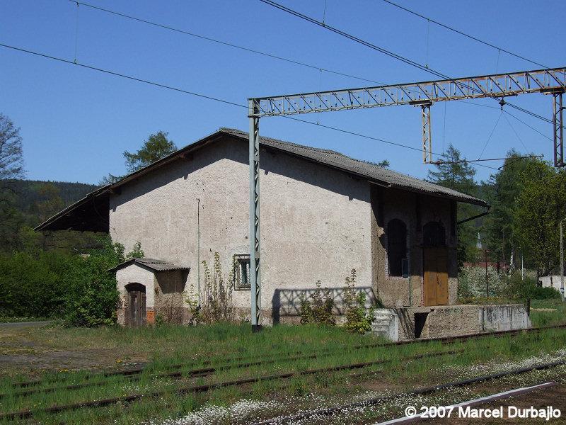 Janowice Wielkie. Budynek gospodarczy od strony peronów. W prawo Jelenia Góra, w lewo dworzec, dalej Marciszów/Wałbrzych.
