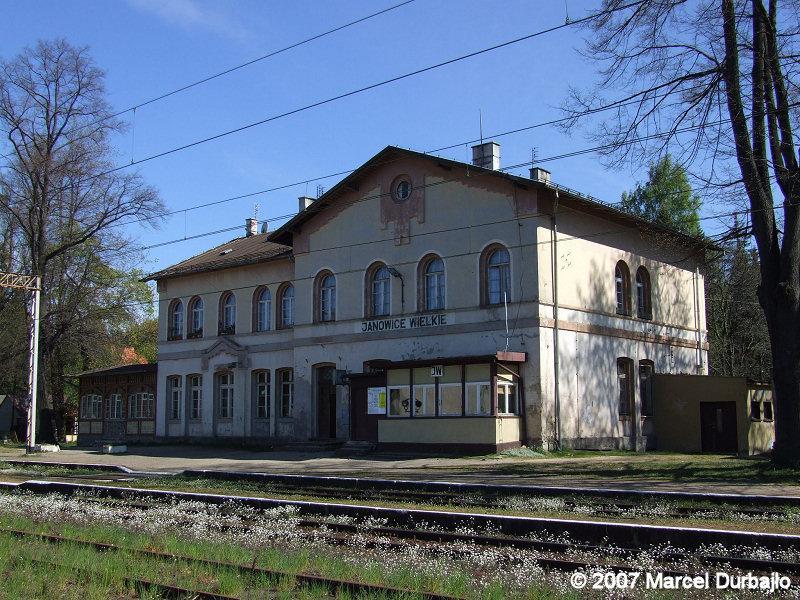 Janowice. Budynek dworca z przybudówką nastawni od strony peronów. W prawo Jelenia Góra, w lewo Marciszów.