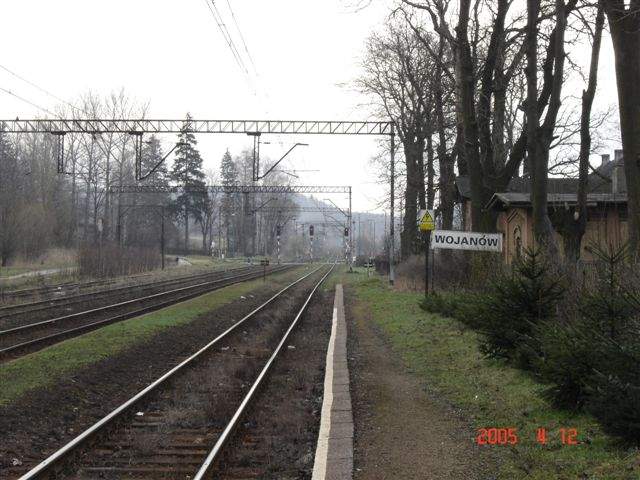Stacja w Wojanowie. Widok w kierunku Jeleniej Góry, z lewej perony i dworzec.