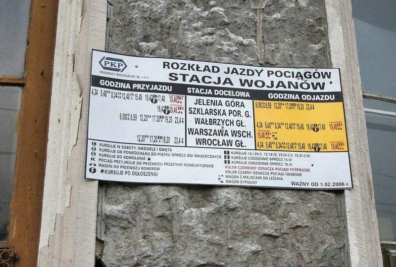 Rozkład jazdy dla stacji w Wojanowie, przymocowany do budynku dworca.