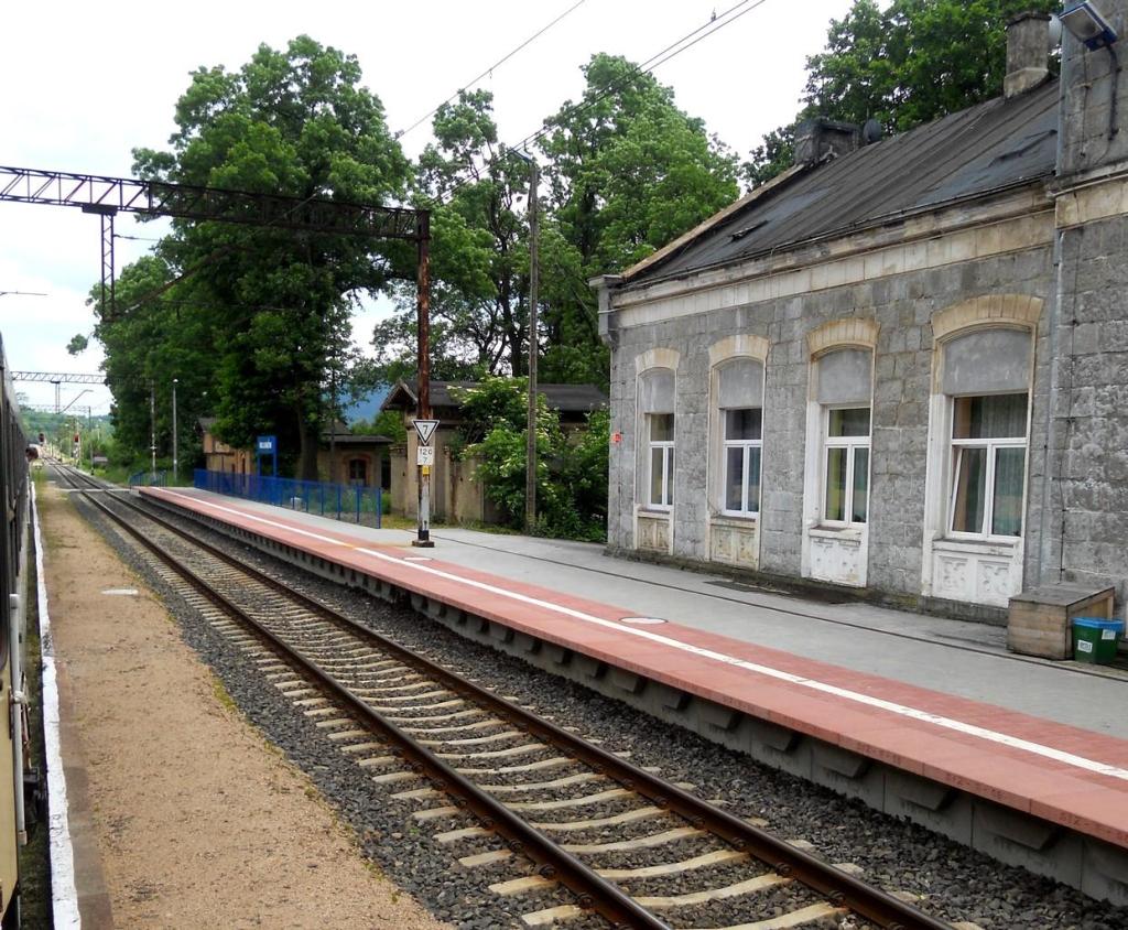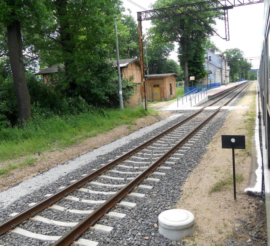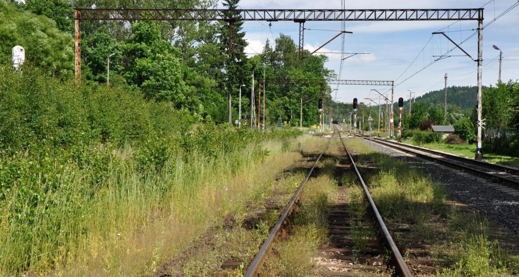120.7 km. Widok w kierunku Jeleniej Góry. Od lewej: peron 1, tor 2, peron 2, tor 1, zarośniety tor 3.