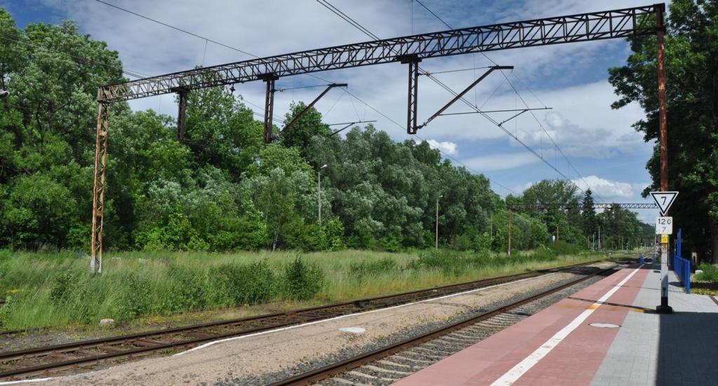 120.7 km. Widok w kierunku Marciszowa. Od prawej: peron 1, tor 2, peron 2, tor 1, zarośniety tor 3. Wskażnik W8 ogranicza prędkość jazdy do 70 km/godz.