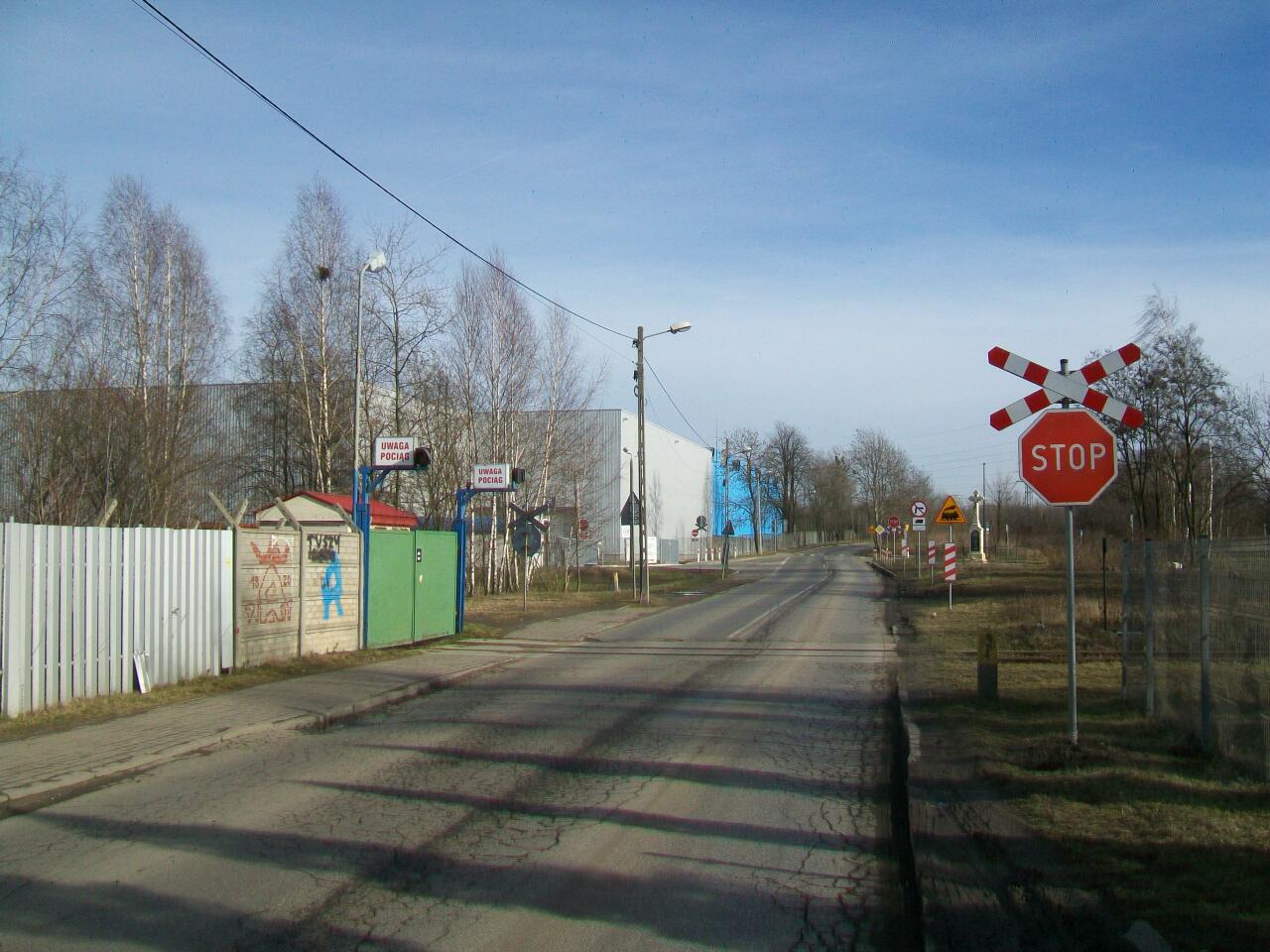 Zachodni przejazd kolejowy przez ul. Fabryczną (a konkretnie dawnej drogi wewnątrzzakładowej, na zachodnim przedłużeniu wymienionej ulicy). Po wybudowaniu bezpośredniego połączenia toru z Chebzie z halą Accelora widoczny tu tor wyciągowy stracił rację bytu i został odcięty od sieci. Widok w kierunku wschodnim; w lewo kozioł oporowy, w prawo hala. Za jakieś 100 m stąd jest kolejny przejazd.