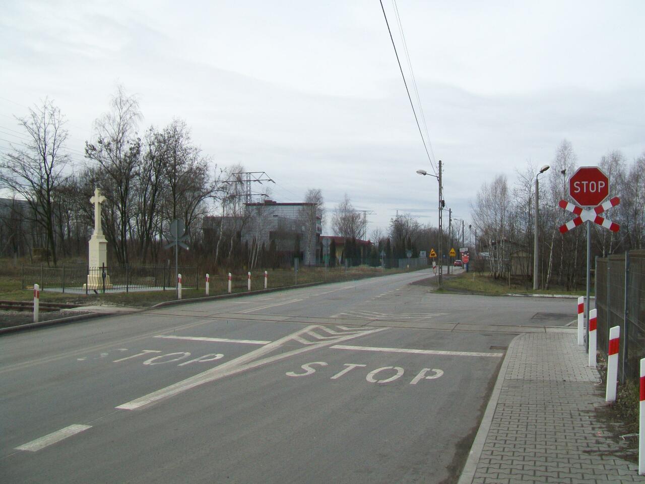 Przejazdy koleje przez ul. Ostatnią (na pierwszym planie) i Kolonia Zygmunt (w tle), niosące tory z Rudy Chebzie (w lewo) z ex. Hutą Zygmunt, obecnie Accelor. Tory łączą się kilkaset metrów w lewo za krzyżem, na wysokości hali Ekoinstalu. Między jezdnią a krzyżem biegł tor łączący Martę (za plecami) z Szybem Jerzy (na wprost). Widok w kierunku zachodnim.