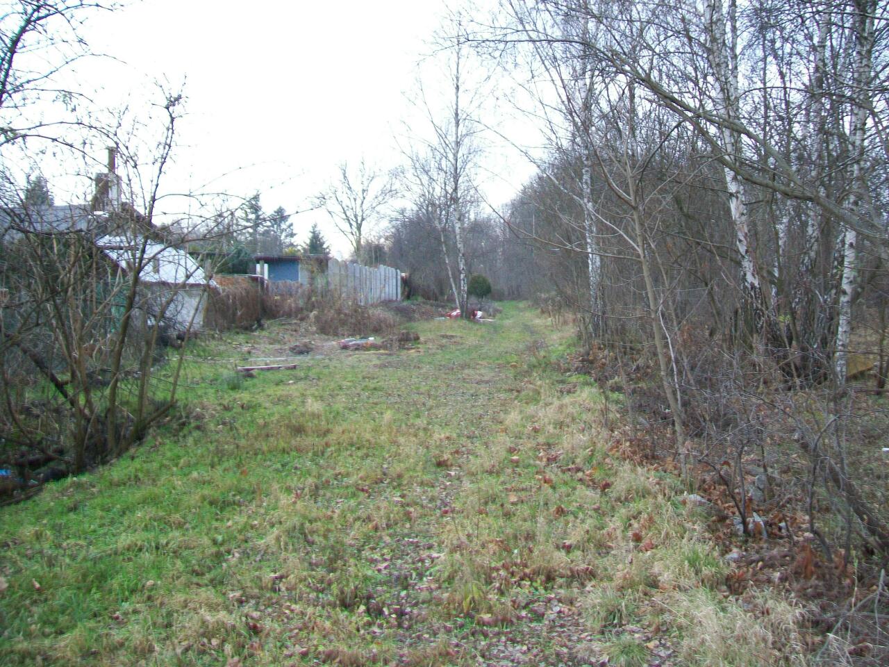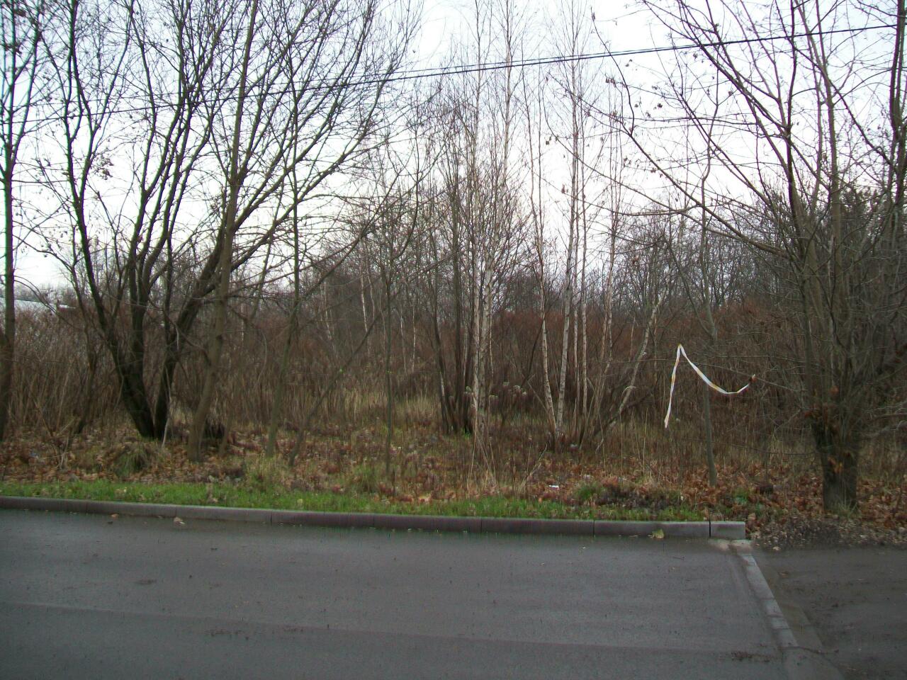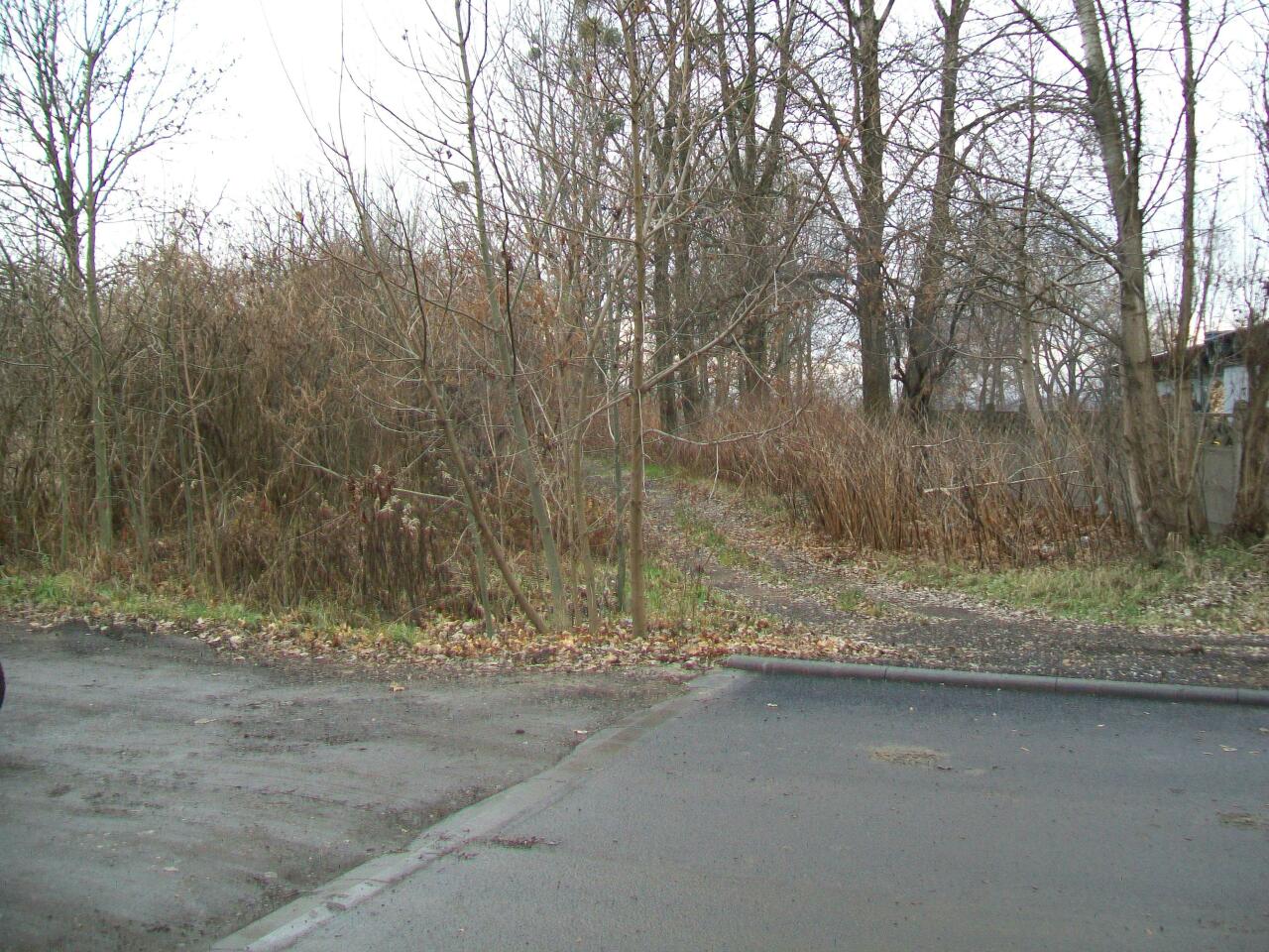 Rozebrany tor, który łączył posterunek Łagiewniki (za plecami) z Hutą Zygmunt (na wprost). Widok w kierunku południowo-zachodnim; z prawej strony (poza kadrem) biegnie ul. Szyby Rycerskie, w przebiegu W-E.