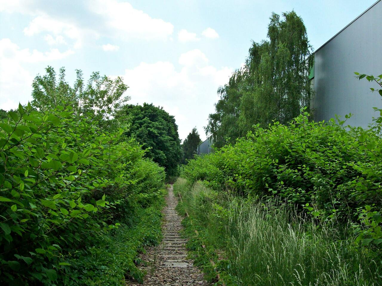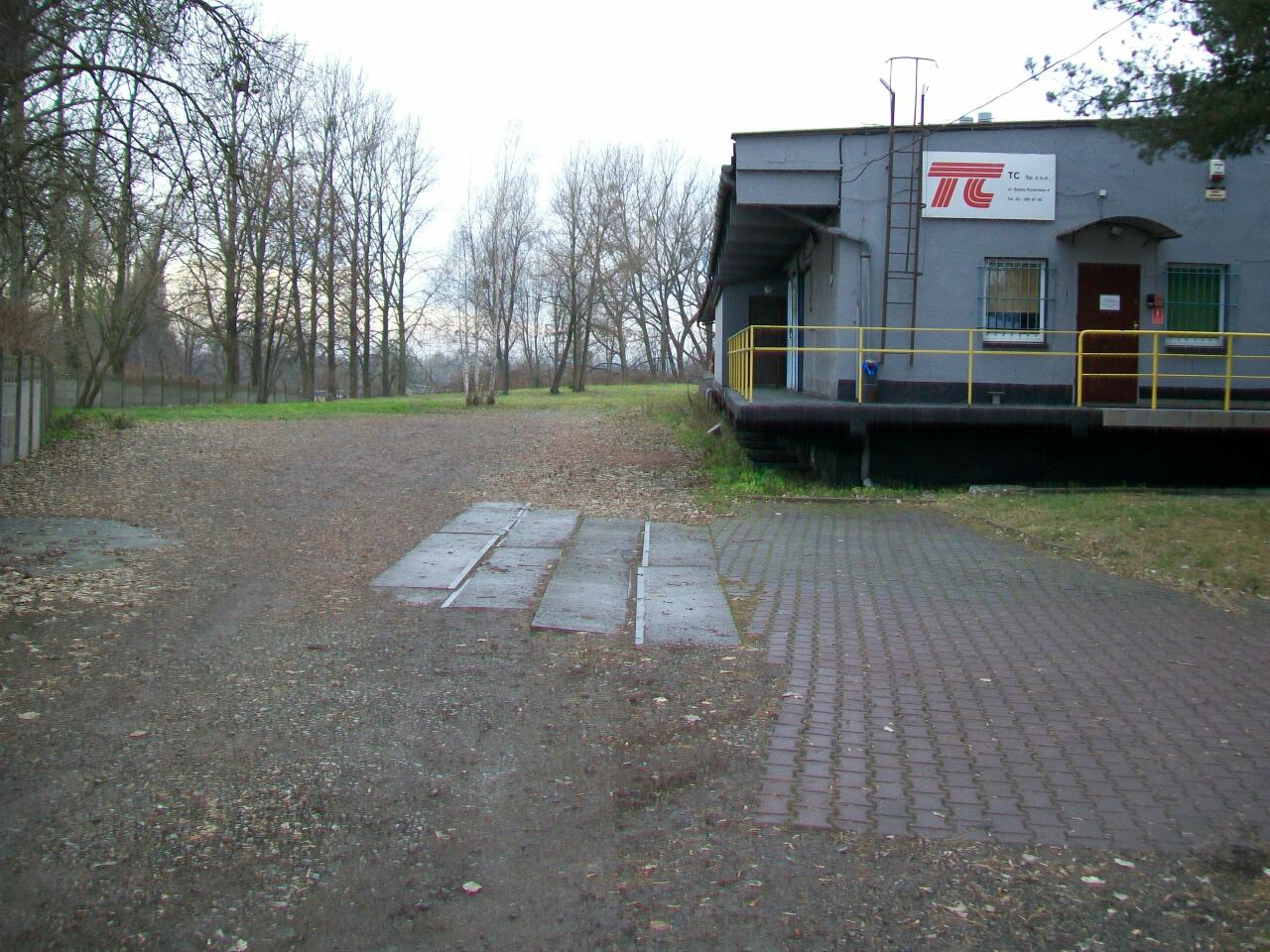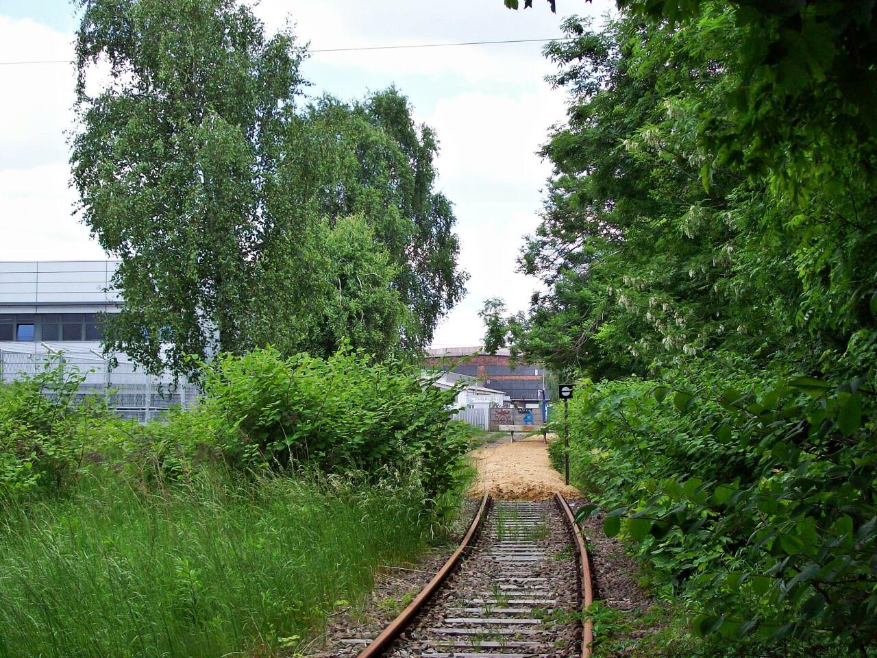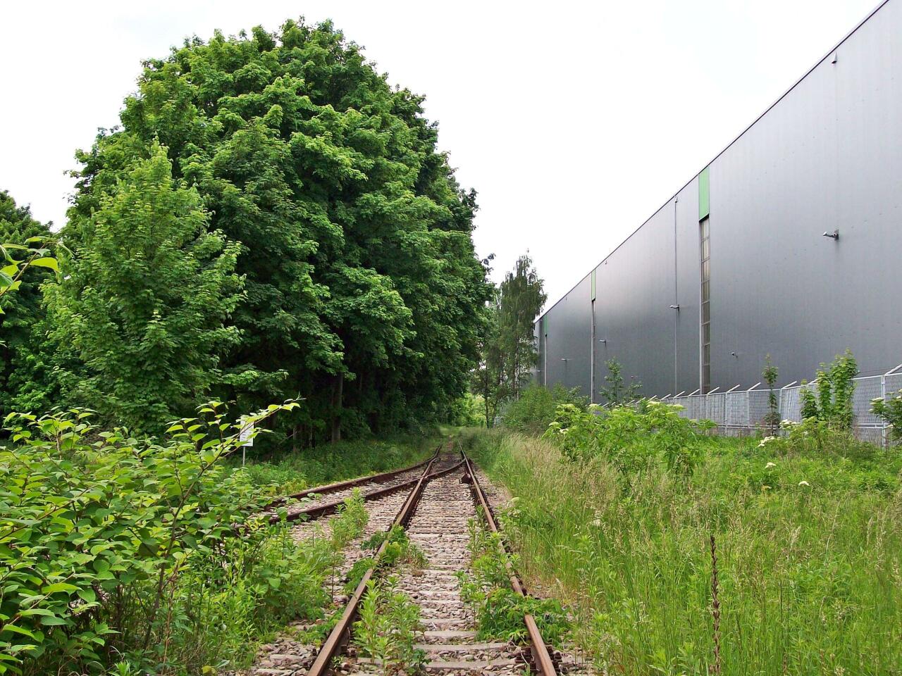 Tuż za zaroślami znajduje się rozjazd, od którego odbija tor prowadzący bezpośrednio do hali magazynowej.