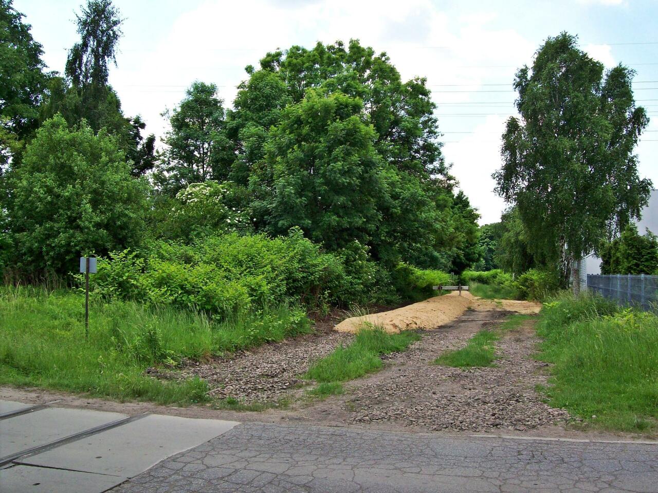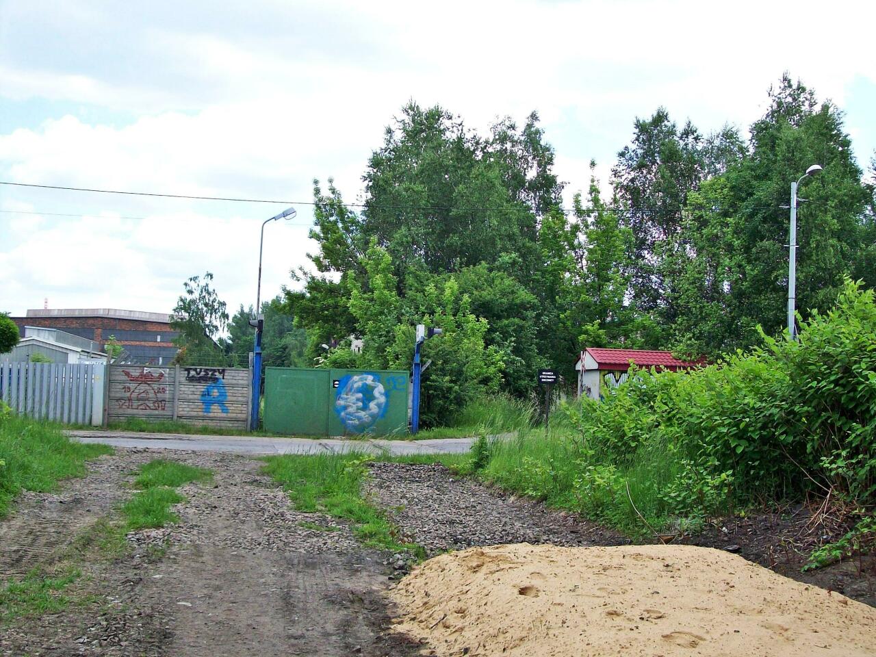 Rozebrany tor, który łączył posterunek Łagiewniki (na wprost) z Hutą Zygmunt (za plecami). Widok w kierunku wschodnim; z lewej strony (poza kadrem) biegnie ul. Szyby Rycerskie, w przebiegu W-E.