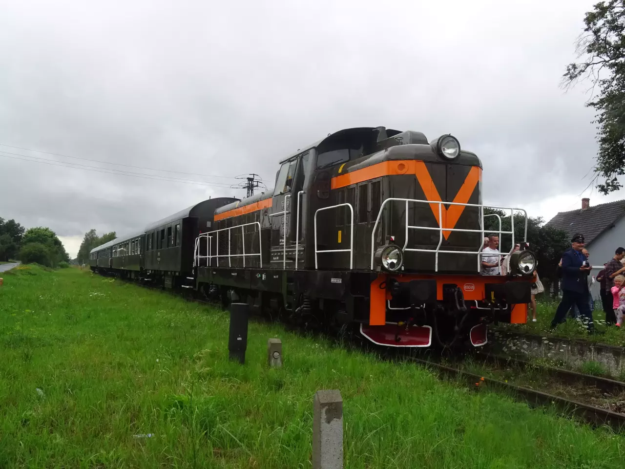SP42-001 z pociągiem specjalnym do Kępna stoi w Poniatowicach. Widok w kierunku Oleśnicy.