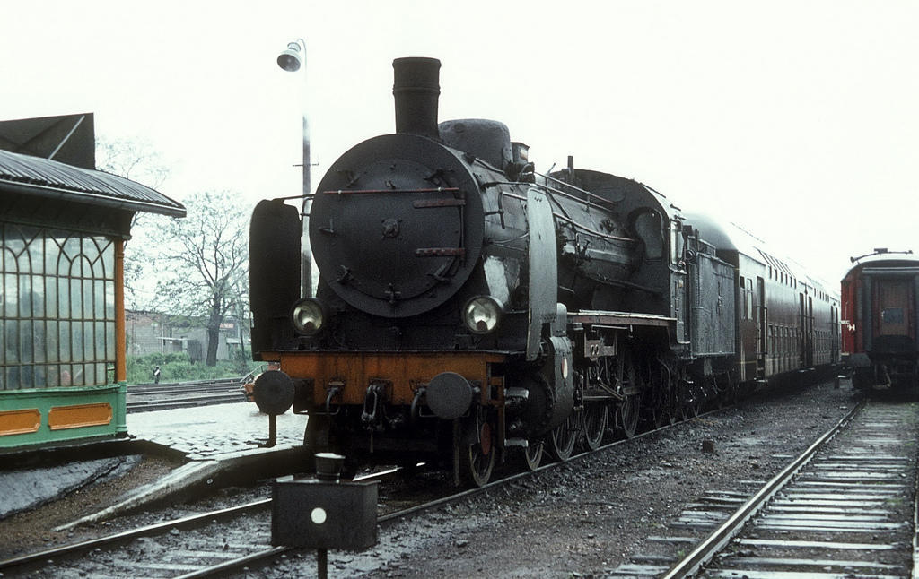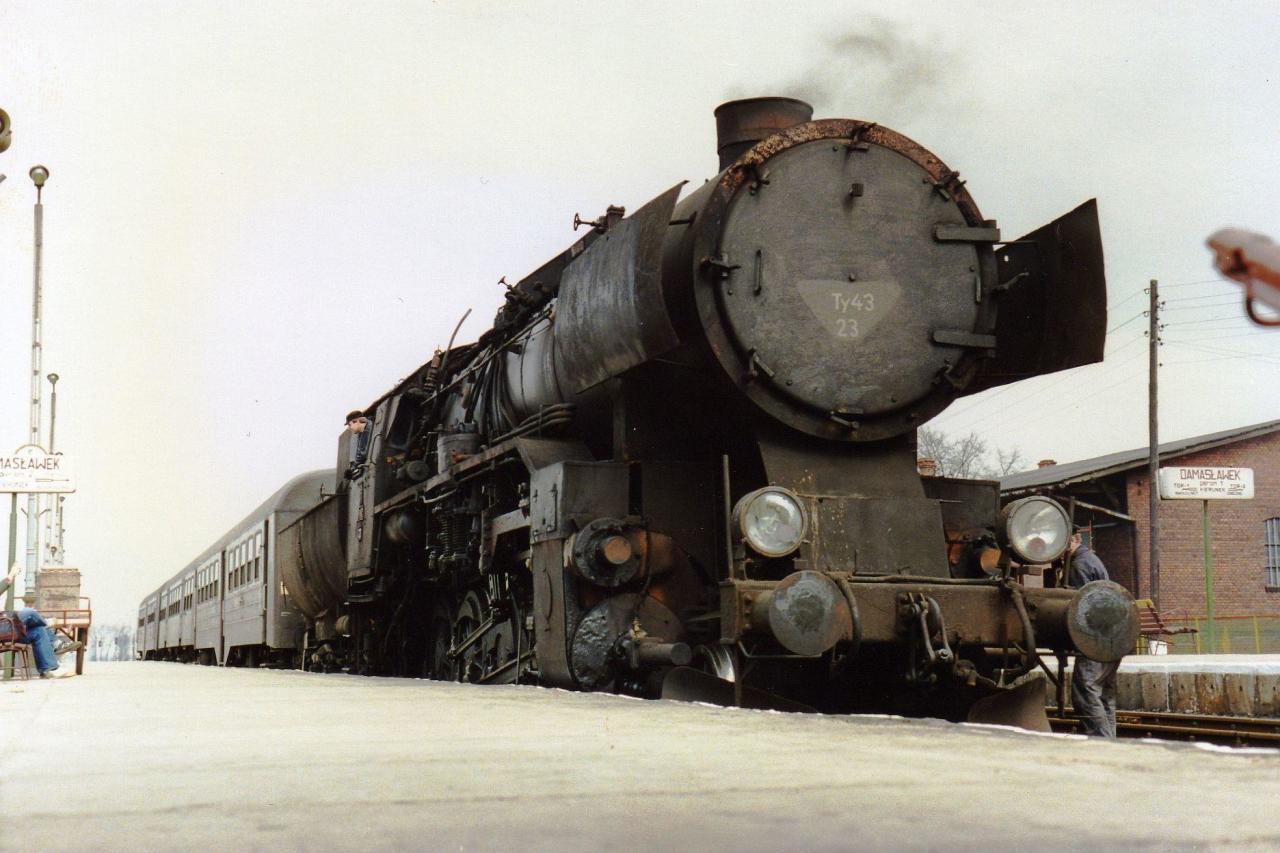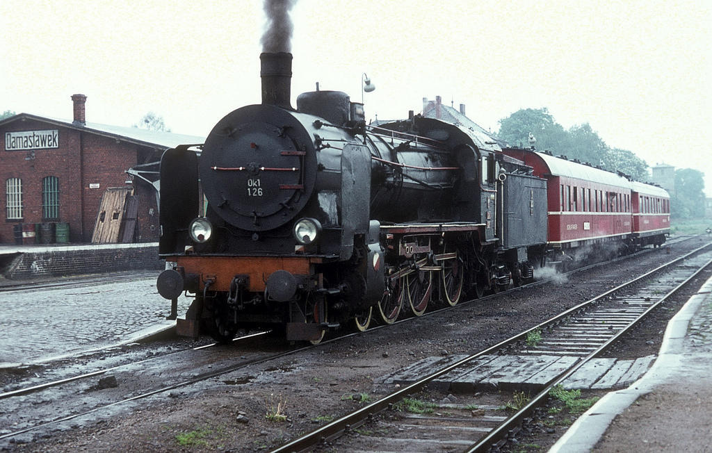 Mijanka w Damasławku. Ok1 przy peronie 1 ze pociągiem specjalnym w kierunku Nakła nad Notecią. Przy peronie 2 stoi rozkładowy pociąg osobowy Nakło nad Notecią - Gniezno. Z lewej strony kolorowe zadaszenie nad wejściem do tunelu dla pieszych. Widok w kierunku północnym, od strony wjazdów z Janowca Wielkopolskiego/Gniezna i Wągrowca.