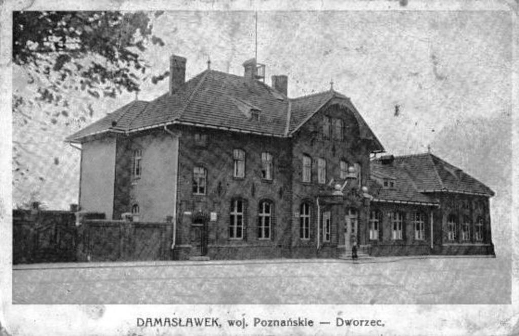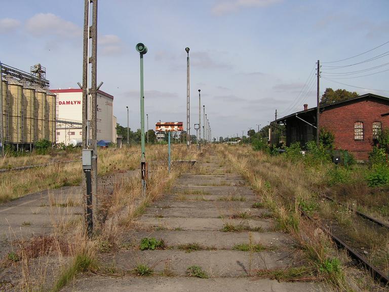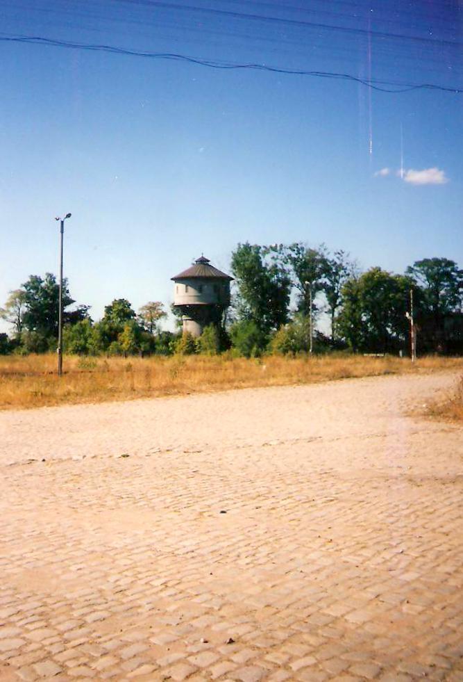 Wieża wodna w Damasławku posadowiona koło nastawni dysponującej (z prawej, poza kadrem). Widok w kierunku północno-zachodnim; w lewo perony, w prawo Kcynia/Chojnice i Żnin.
