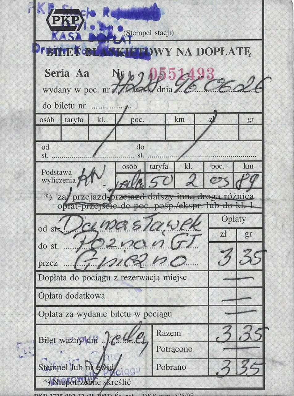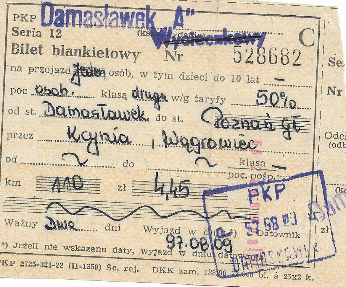Skan biletu do Poznania przez Kcynię, Wągrowiec.
