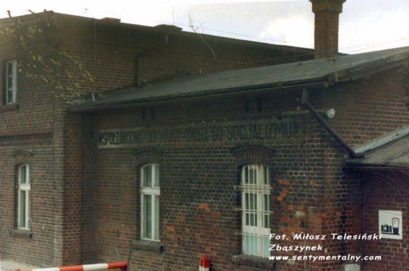 Budynek dworca od strony peronów. Widać propagandowy napis na elewacji.
