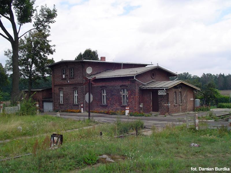 SP 42 001 z turystycznym pociągiem osobowym nr 66211, ze stacji Wrocław Gł. do stacji Kępno, w czasie postoju na dawnej stacji Cieśle. Widok w stronę Oleśnicy/Wrocławia. Pociąg uruchomiony przez Klub Sympatyków Kolei we Wrocławiu w ramach pożegnania odcinka Oleśnica-Kępno na czas remontu infrastruktury. Z lewej dawny magazyn towarowy.