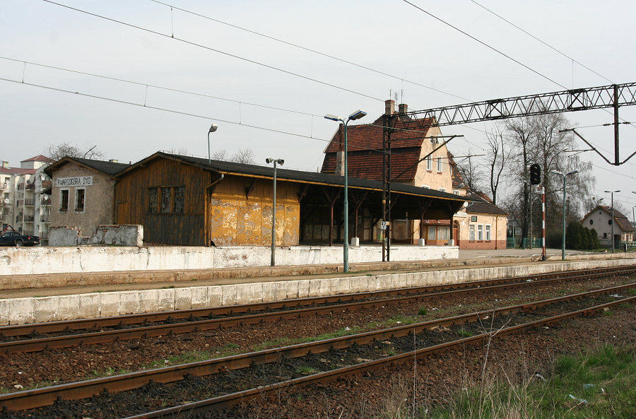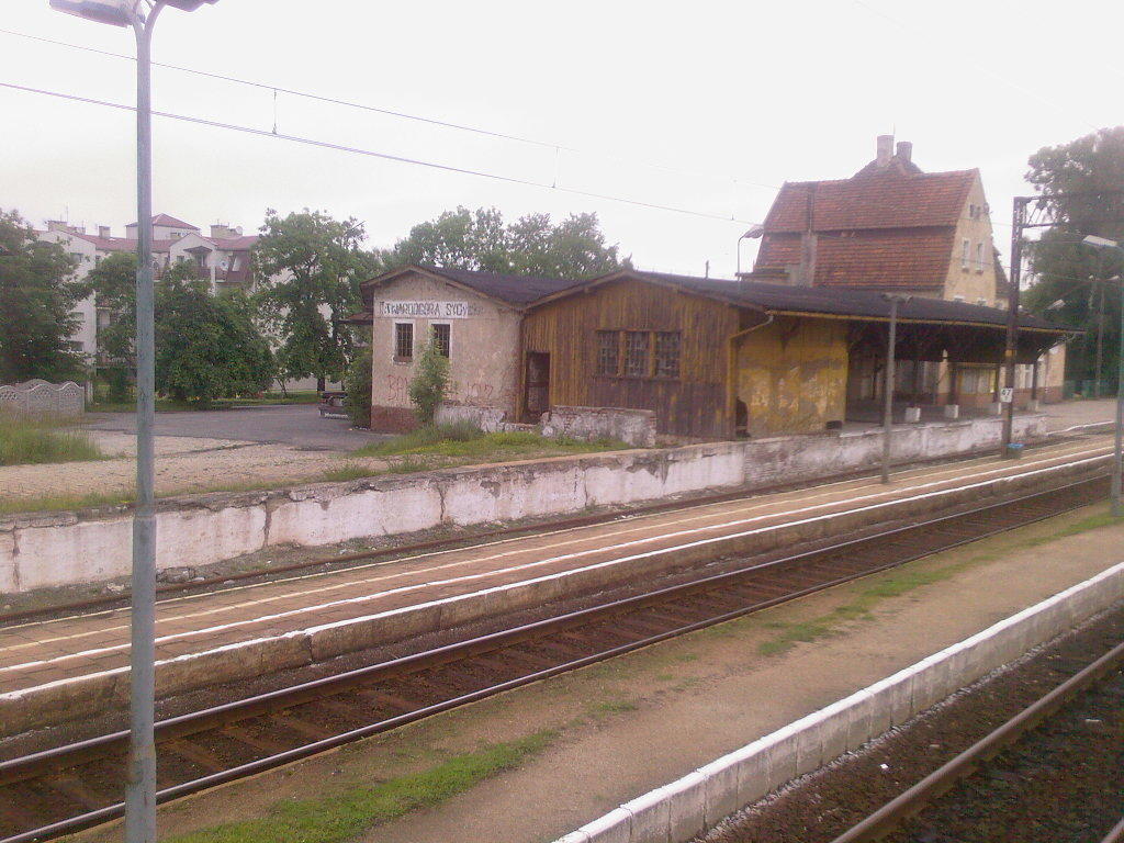 Stacja PKP Twardogóra Sycowska. Widok na zabudowania stacyjne z pociągu "Sudety" relacji Wrocław Główny - Warszawa Wschodnia.